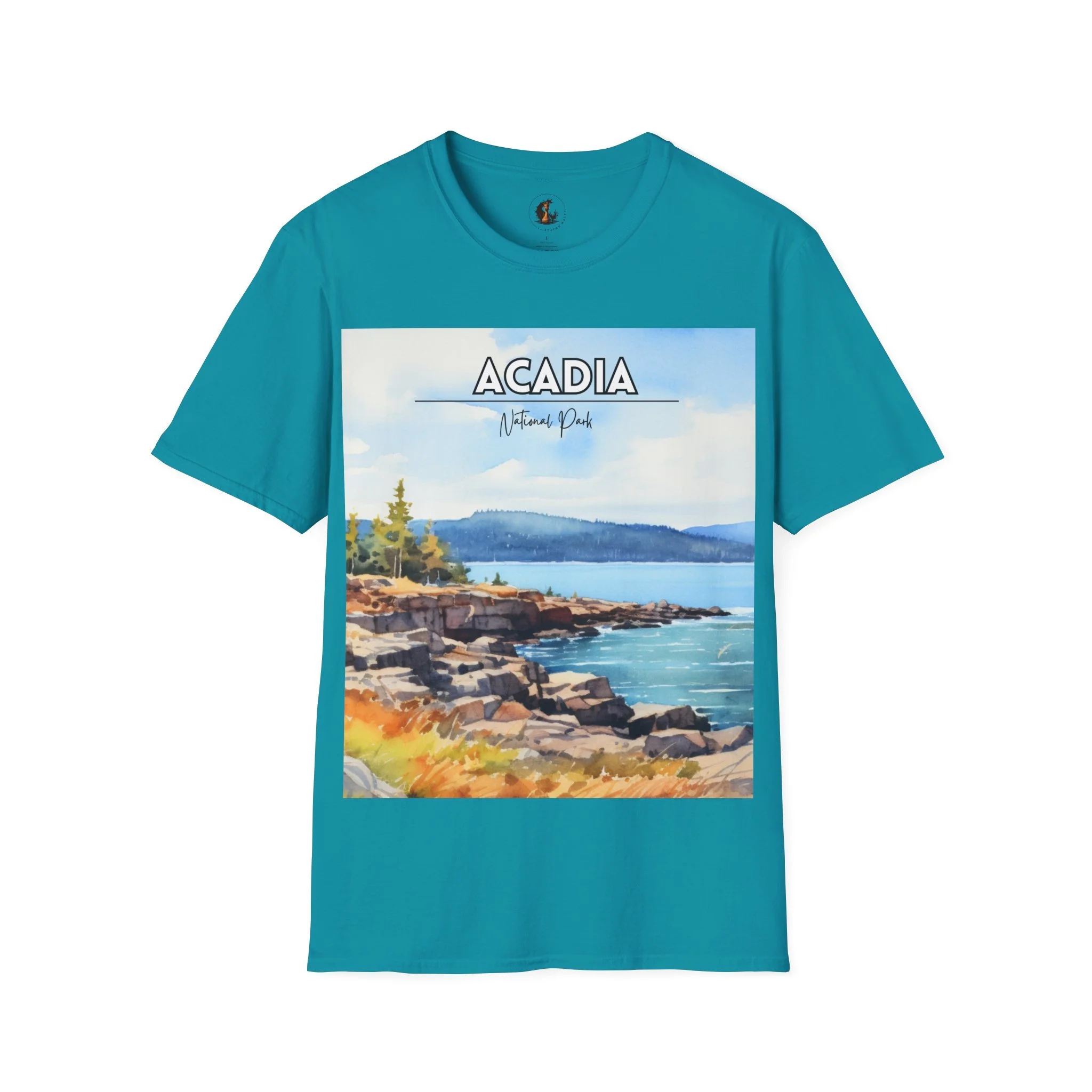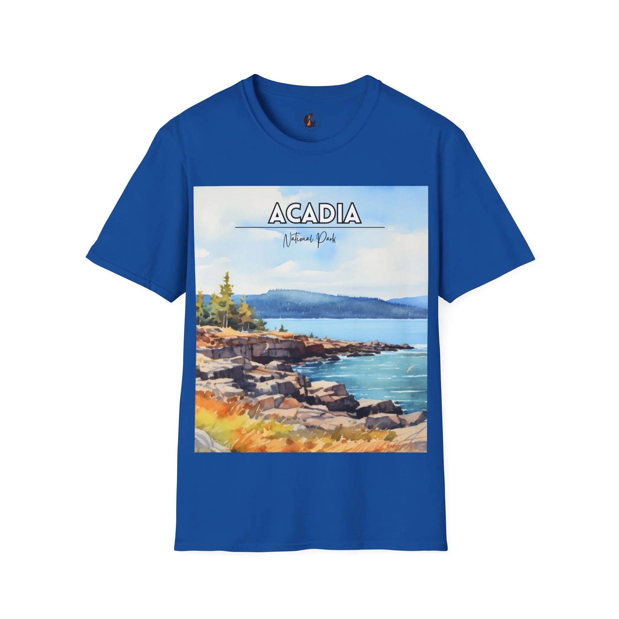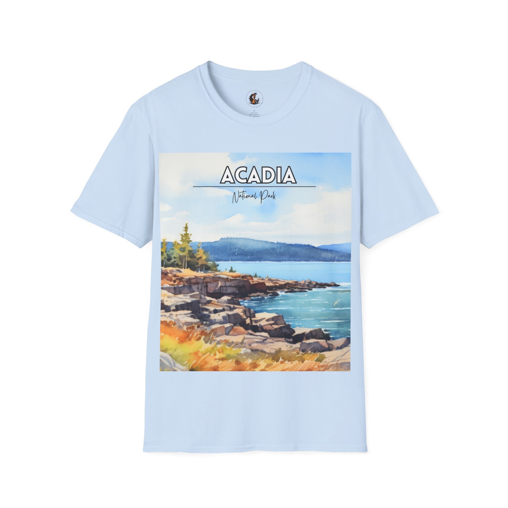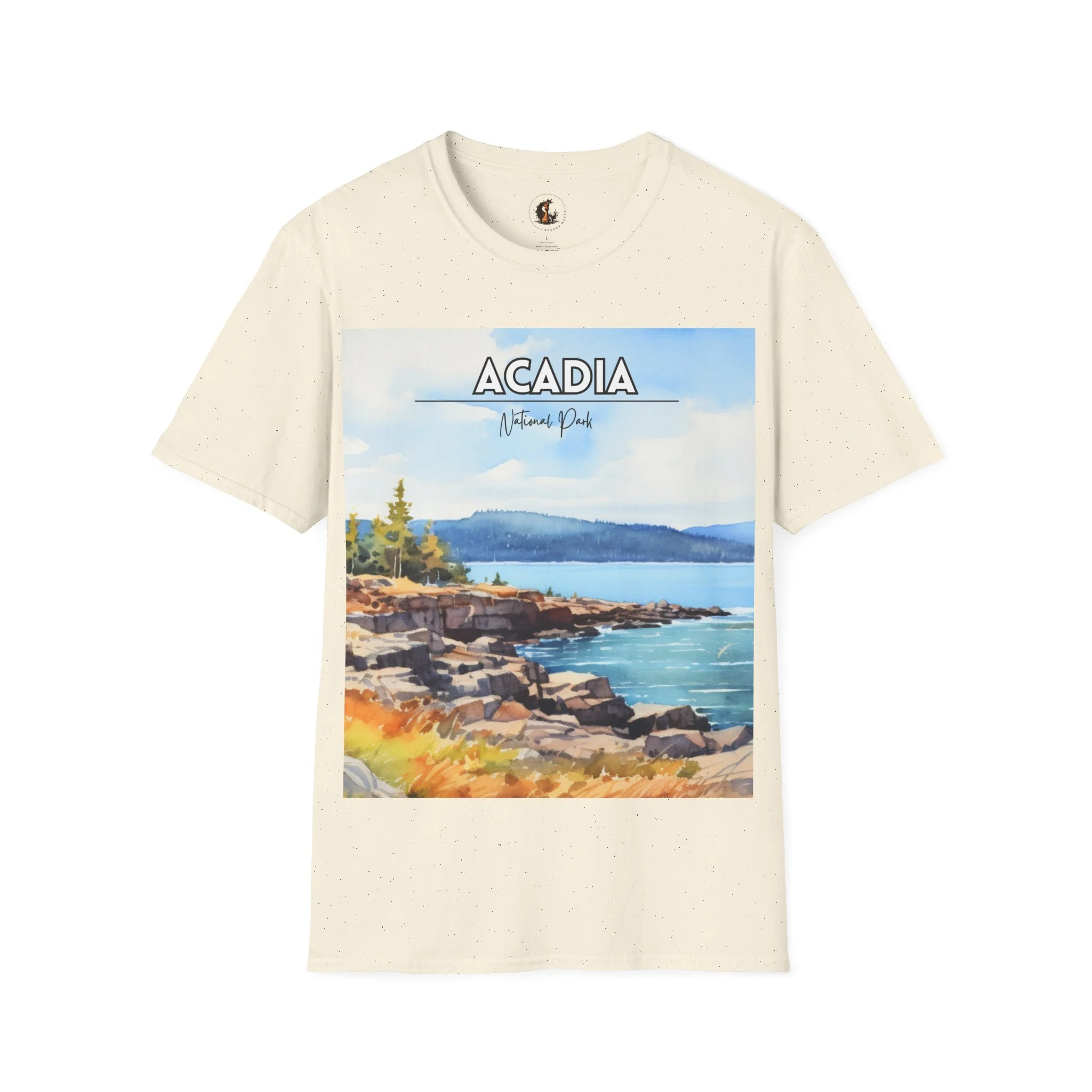 This Acadia National Park watercolor T-shirt is inspired by the dramatic meeting of land and sea—granite cliffs, evergreen forests, and the shifting blues of the Atlantic. The artwork begins as an original painting, built through layered washes and expressive strokes to capture light, movement, and atmosphere.
