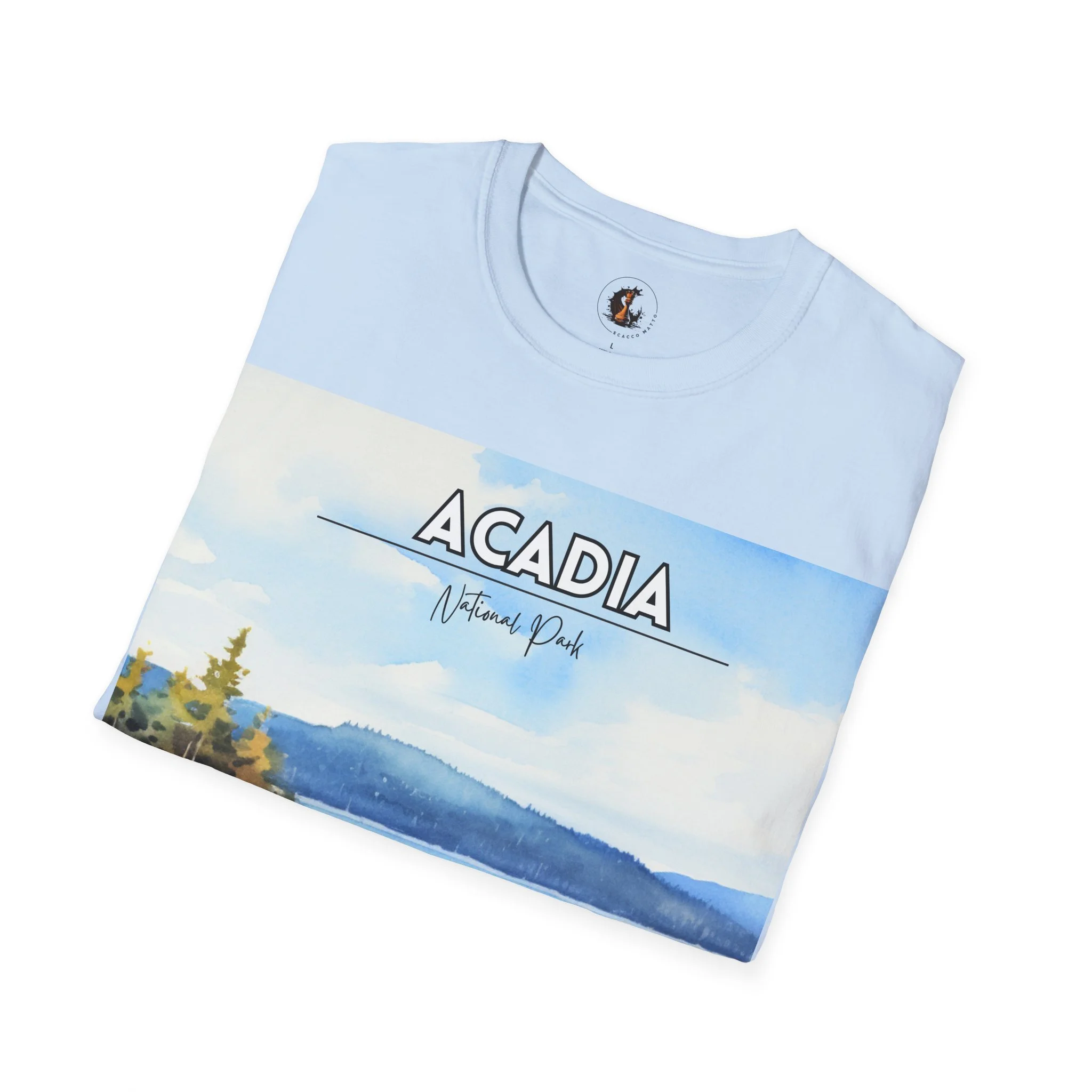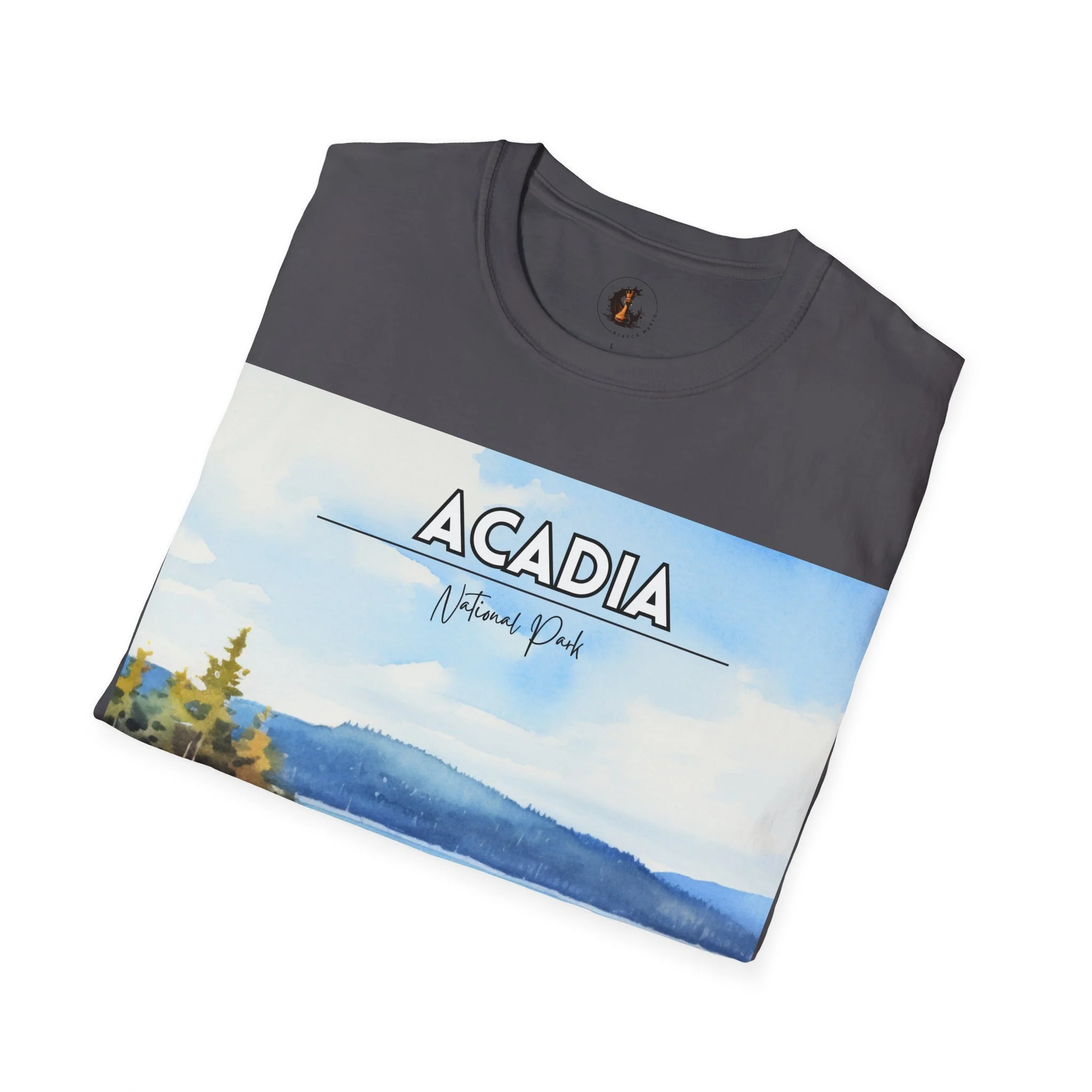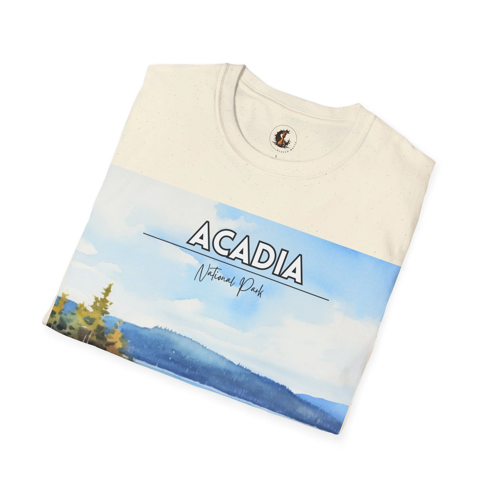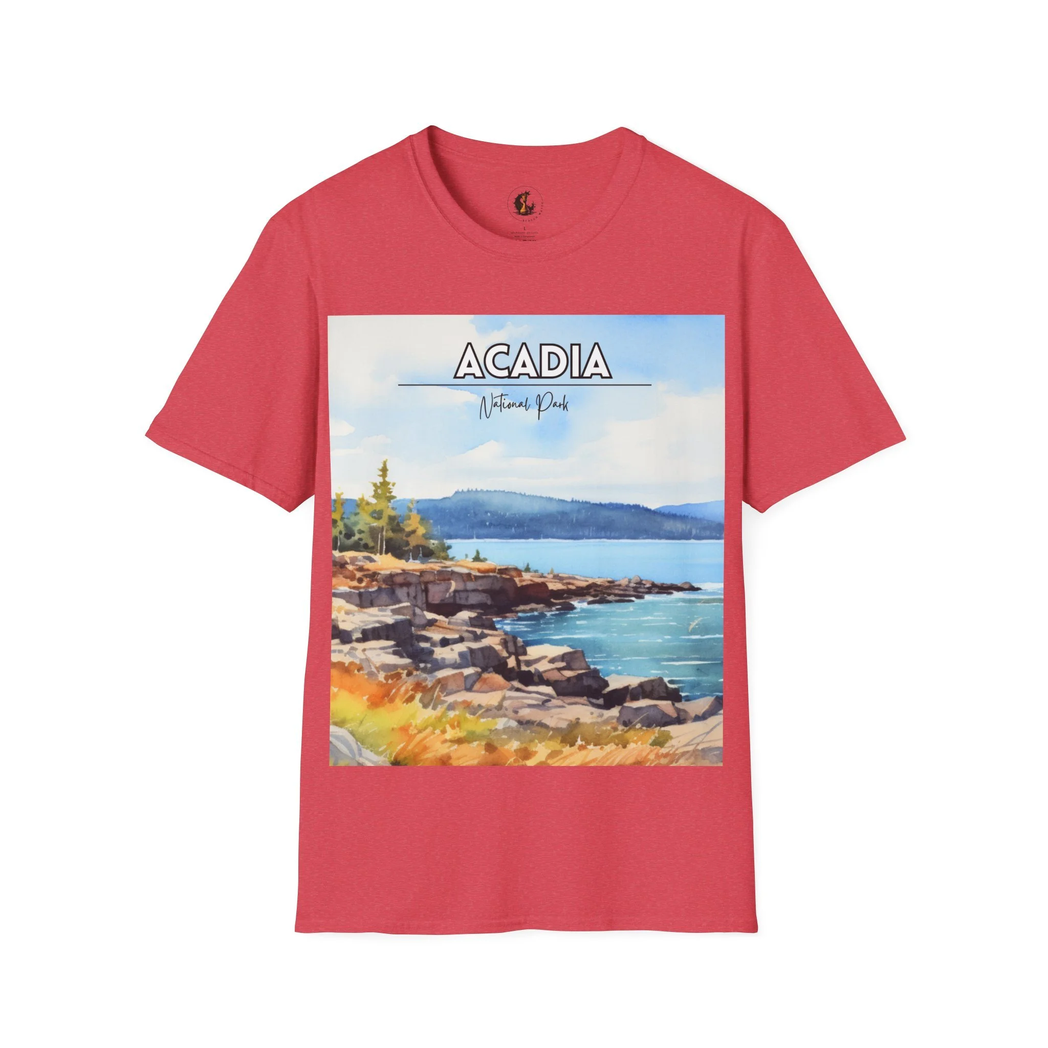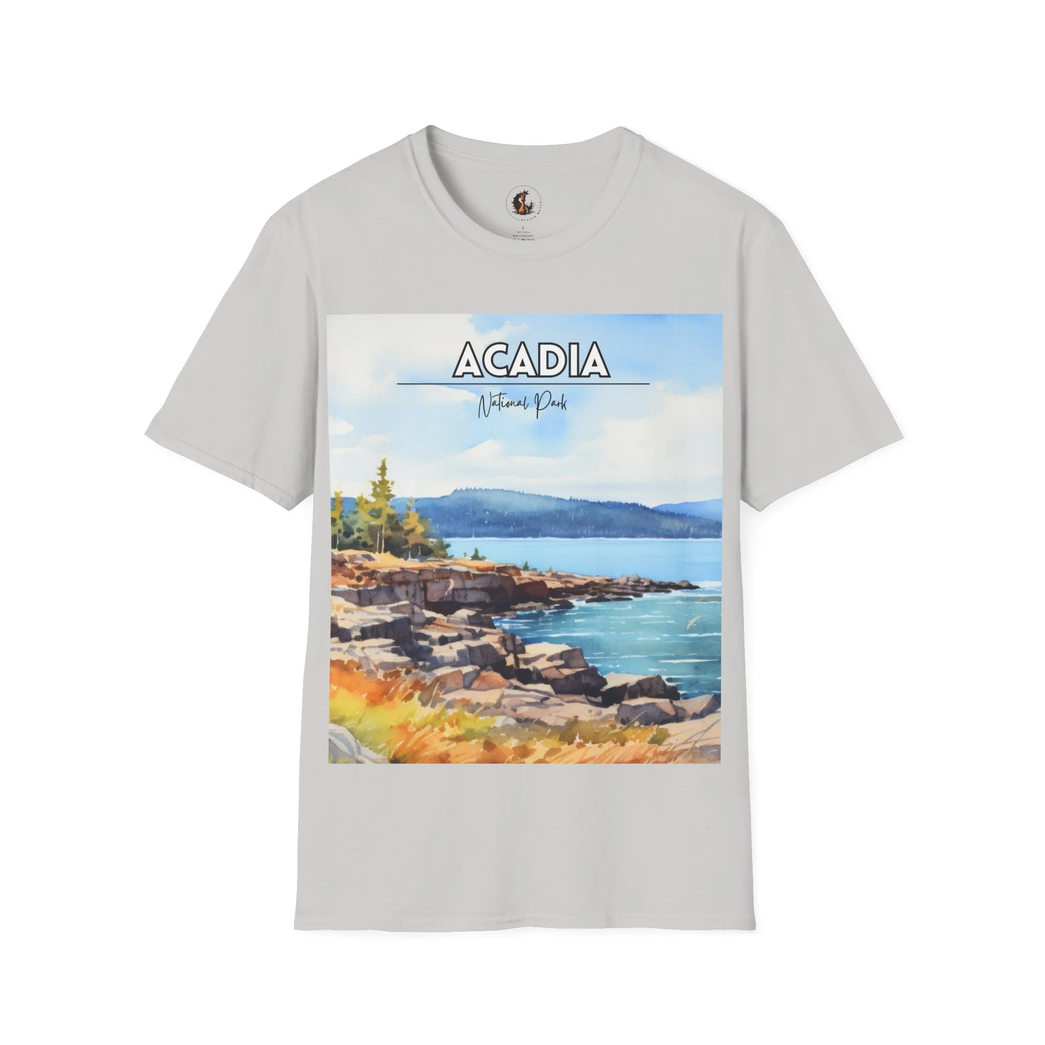 This Acadia National Park watercolor T-shirt is inspired by the dramatic meeting of land and sea—granite cliffs, evergreen forests, and the shifting blues of the Atlantic. The artwork begins as an original painting, built through layered washes and expressive strokes to capture light, movement, and atmosphere.