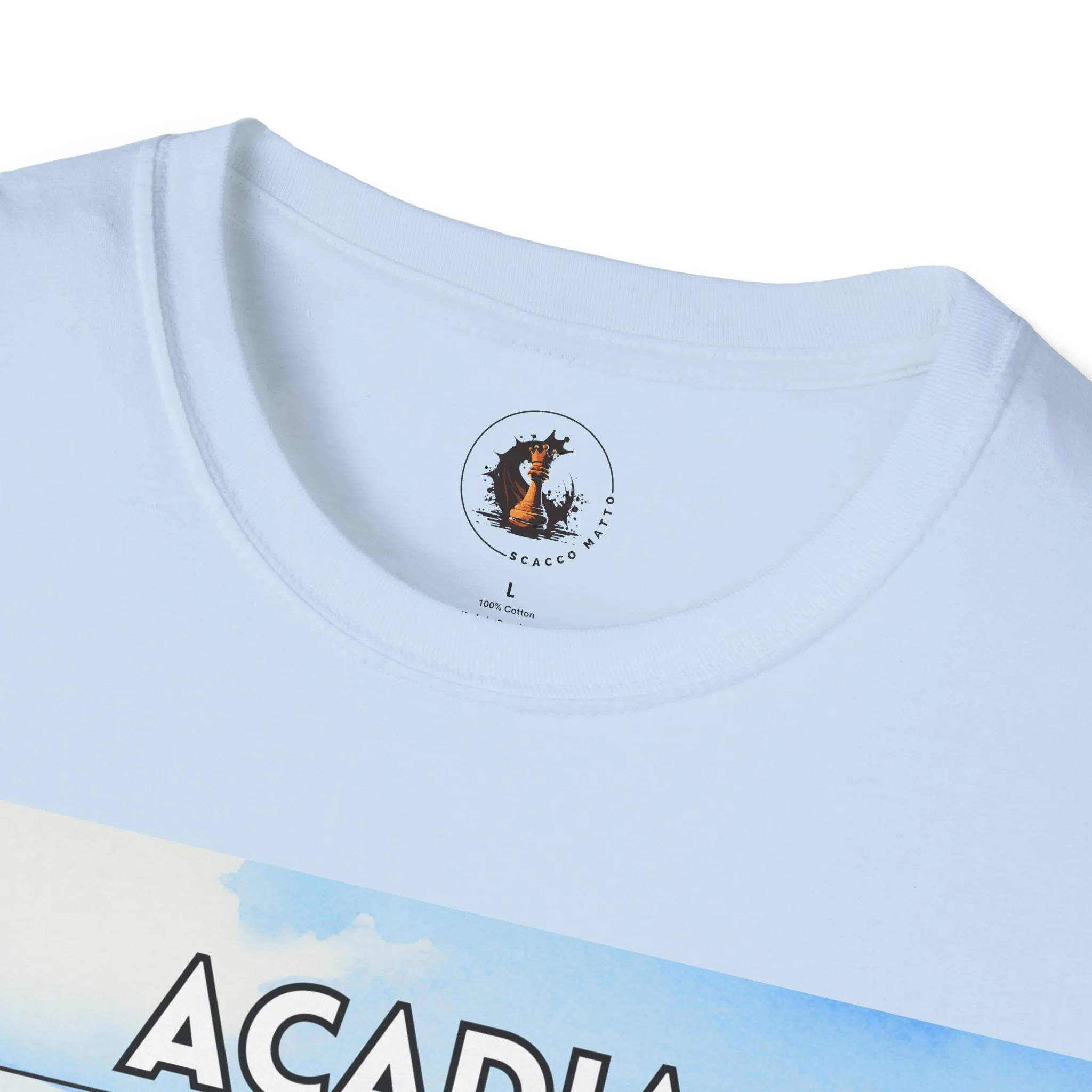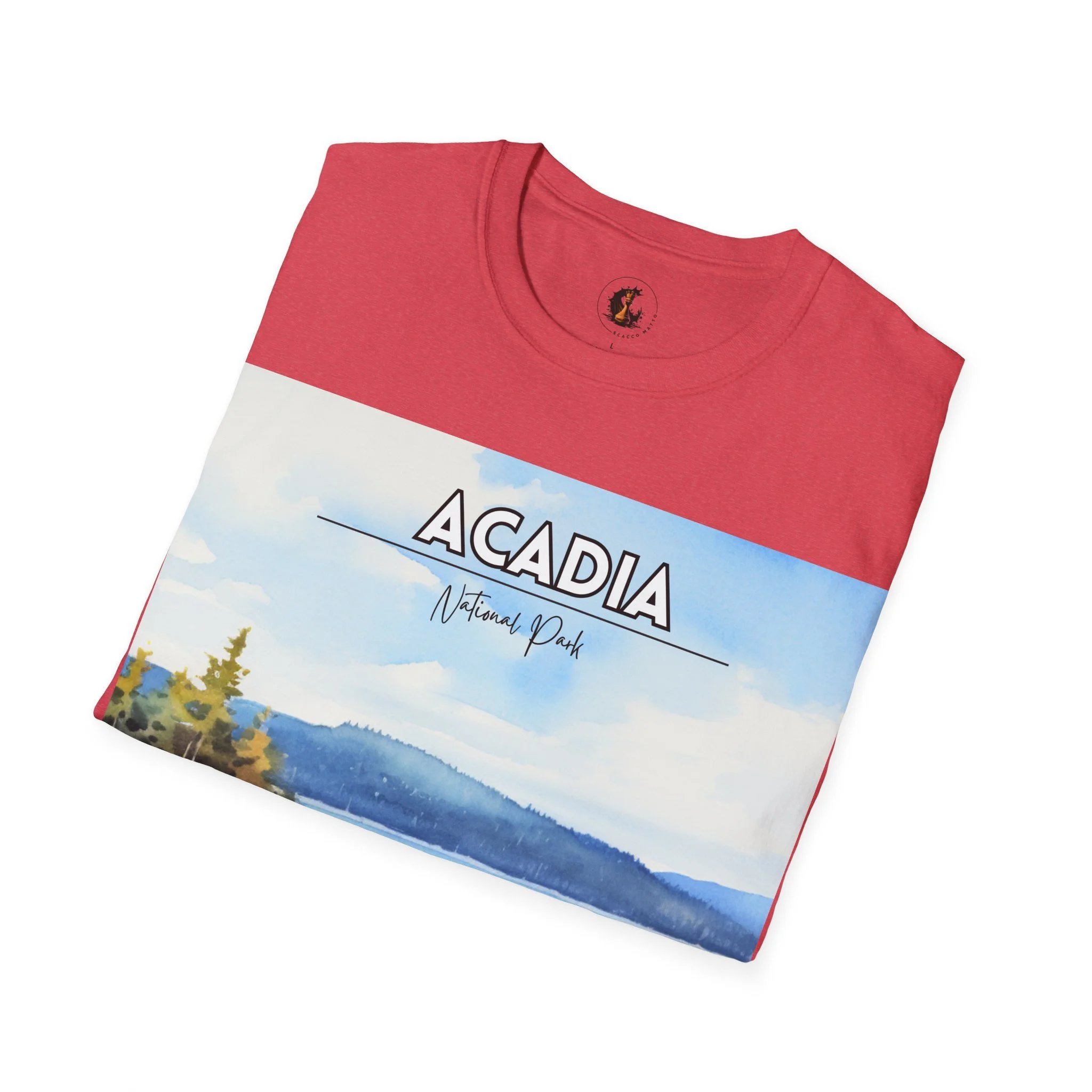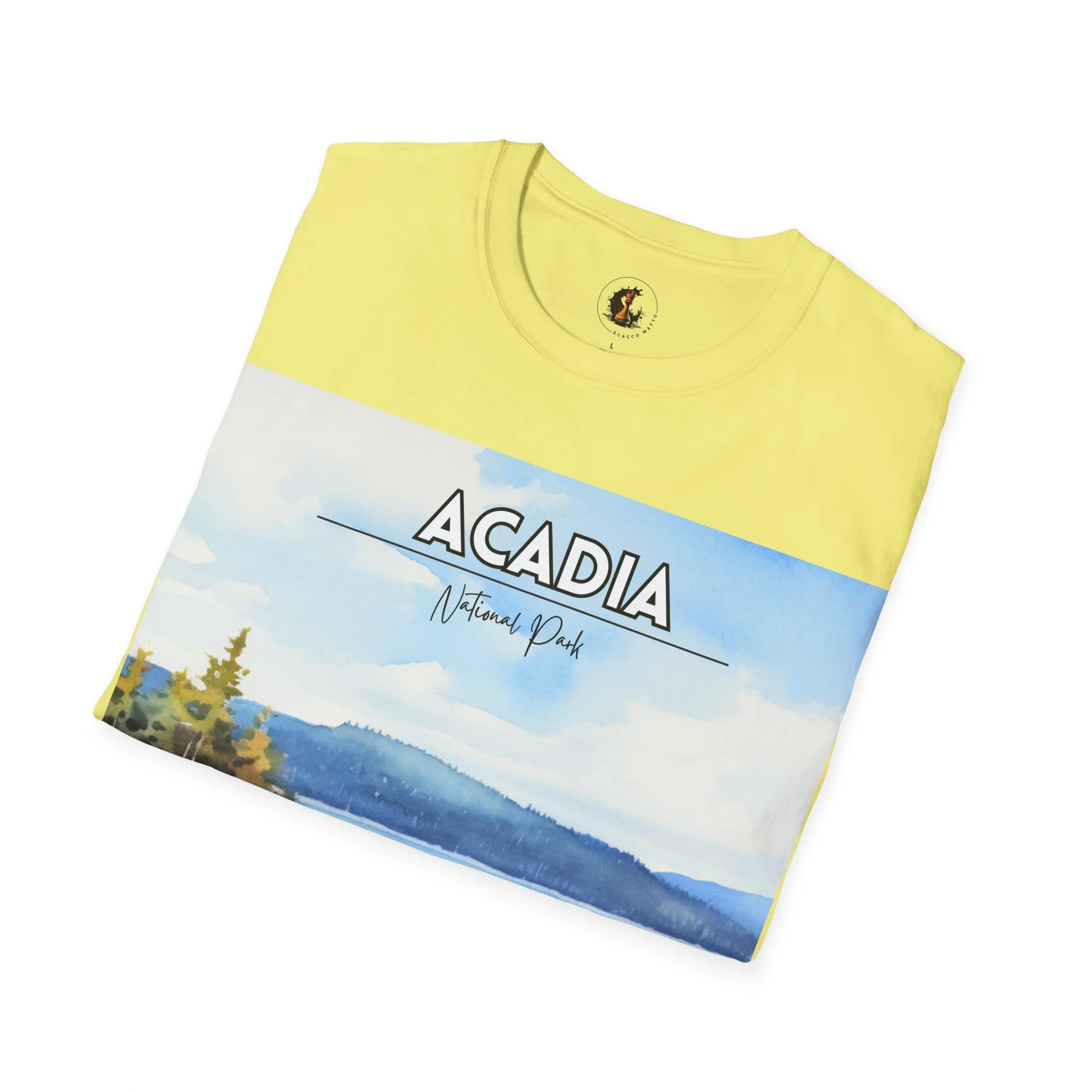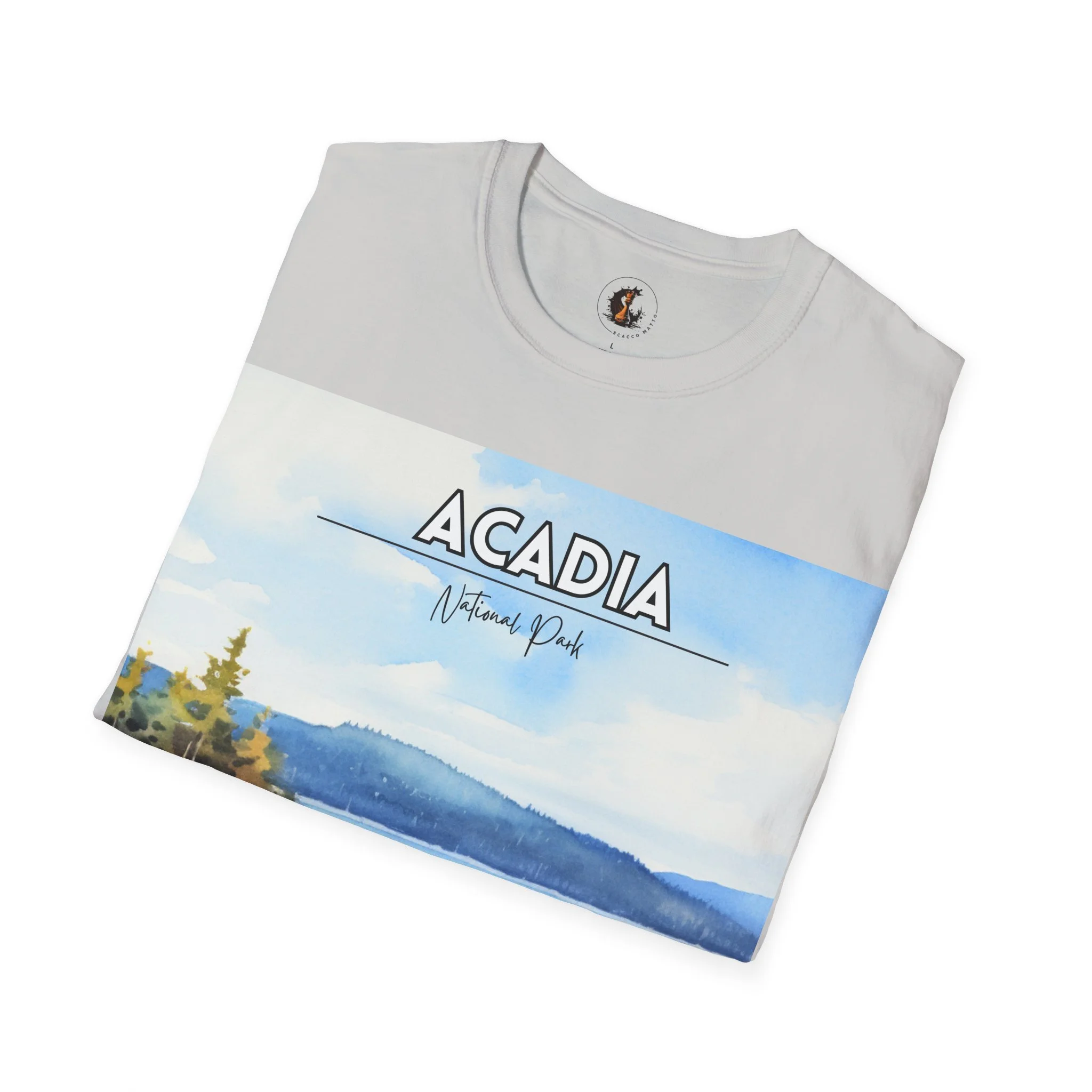 This Acadia National Park watercolor T-shirt is inspired by the dramatic meeting of land and sea—granite cliffs, evergreen forests, and the shifting blues of the Atlantic. The artwork begins as an original painting, built through layered washes and expressive strokes to capture light, movement, and atmosphere.