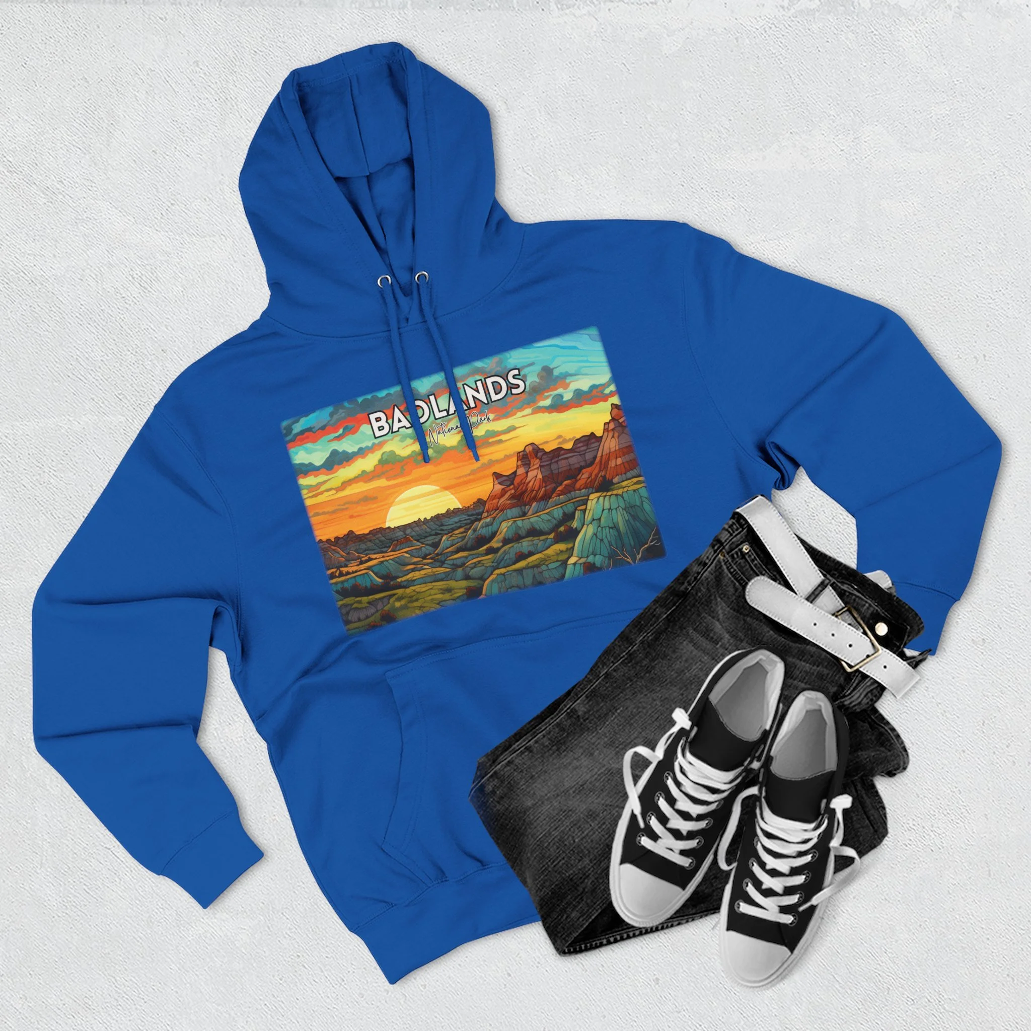 Capture the bold glow of a Badlands sunset with this Badlands National Park Hoodie, featuring original abstract acrylic artwork by Scacco Matto inspired by the park’s dramatic ridges and evening light. The design began as an expressive acrylic painting blending warm reds, golds, and deep earth tones to reflect the movement, color shifts, and layered textures of sunset across the formations. The premium unisex fleece offers dependable softness, warmth, and a comfortable everyday fit, while DTG printing preserves the rich acrylic details with lasting clarity and color. Add this Badlands sunset hoodie to your wardrobe and carry the energy of golden-hour landscapes wherever you go.
