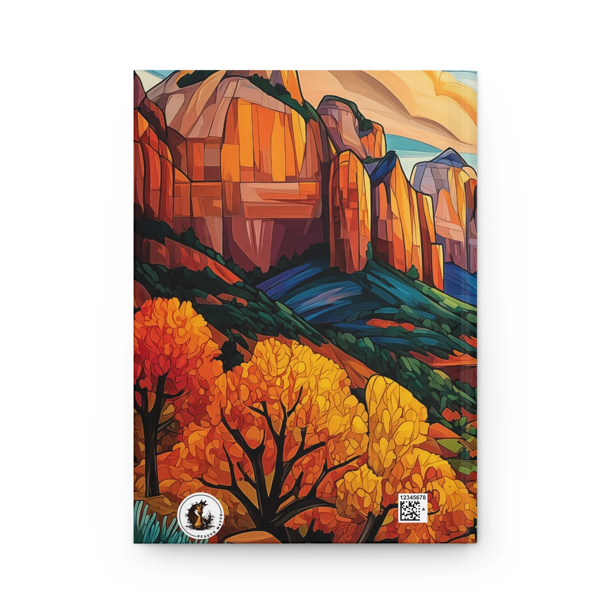 Capture your thoughts, ideas, and memories in this abstract acrylic art journal inspired by the vivid autumn tones and dramatic landscape of Kolob Canyons. The design brings together warm sandstone cliffs, golden foliage, layered canyon forms, and shifting seasonal light to create a journal that feels both expressive and grounded.