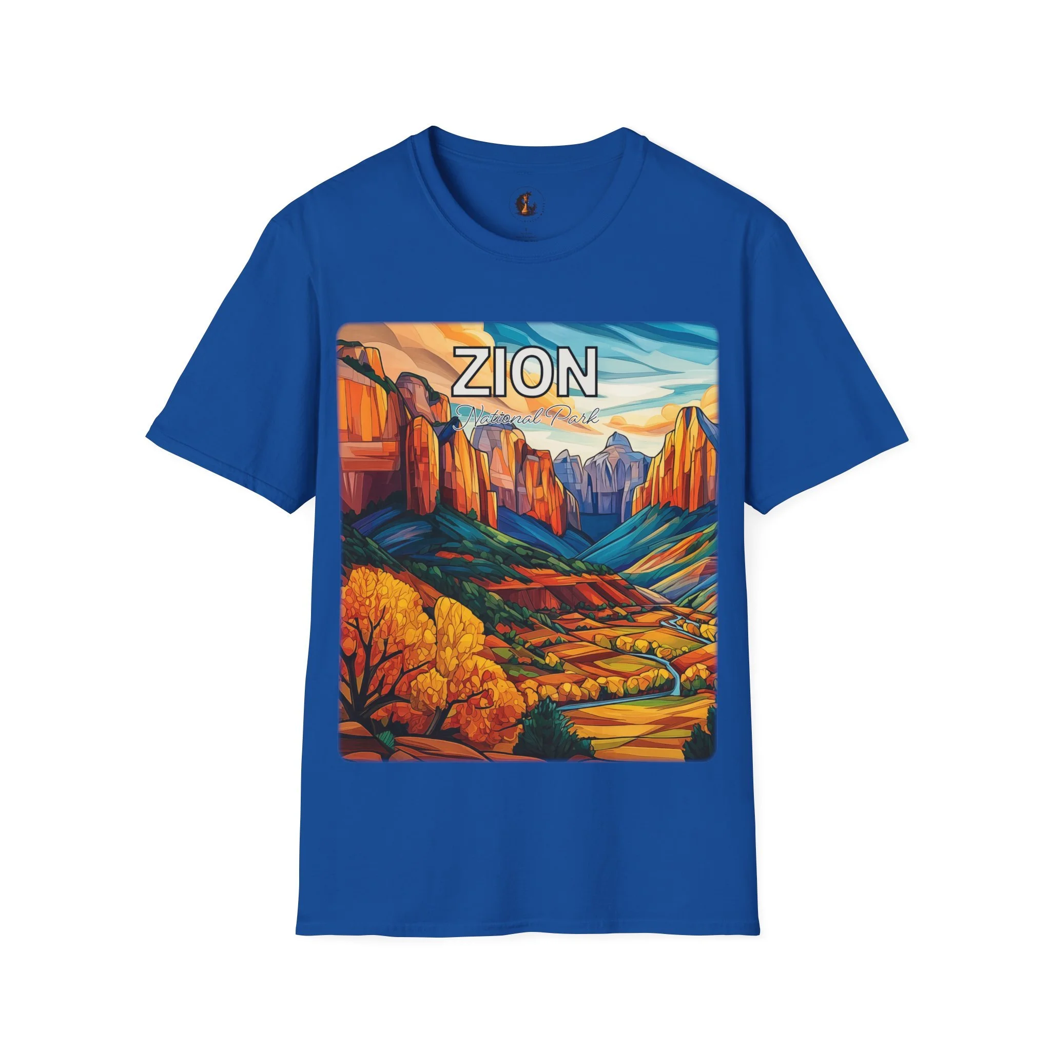 Celebrate the beauty of autumn in Zion with this abstract acrylic art T-shirt inspired by the fall colors of Kolob Canyons. Designed around the vivid contrast of sandstone cliffs, golden foliage, blue sky, and shifting seasonal light, this shirt brings an artistic sense of place into everyday wear.