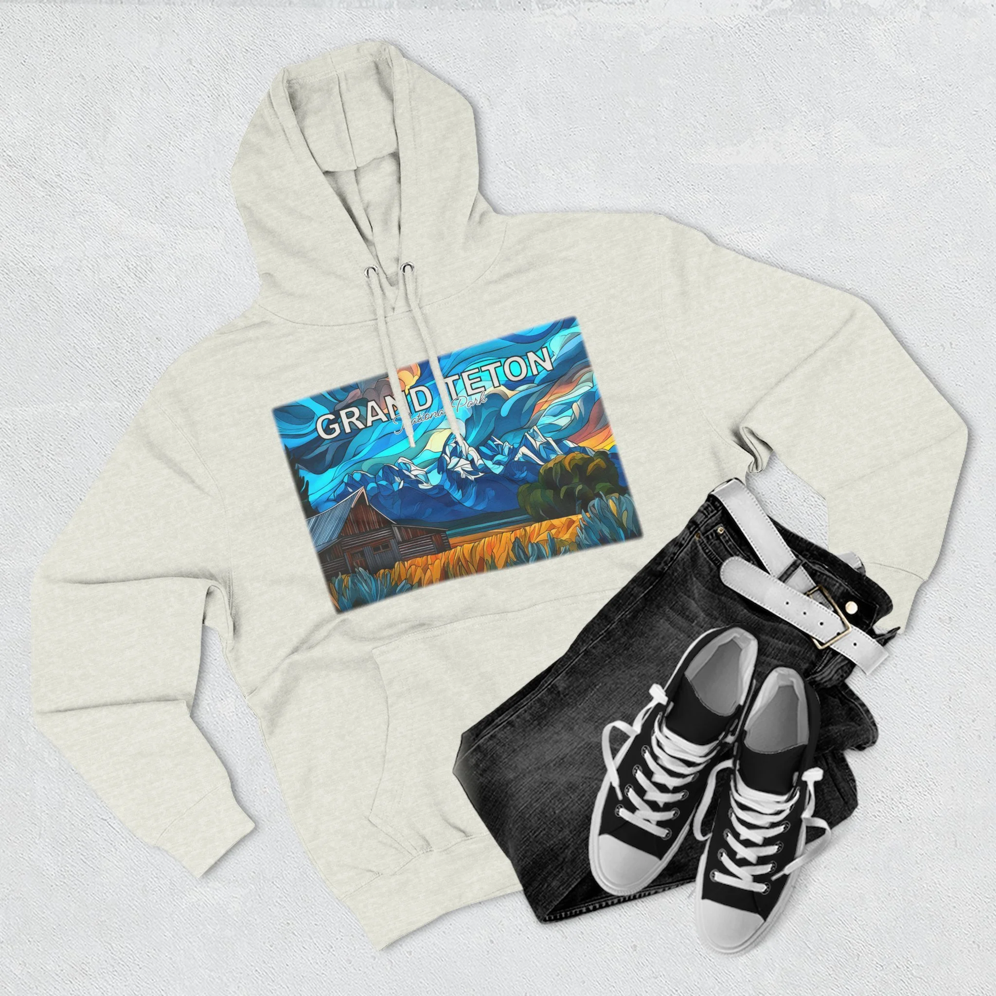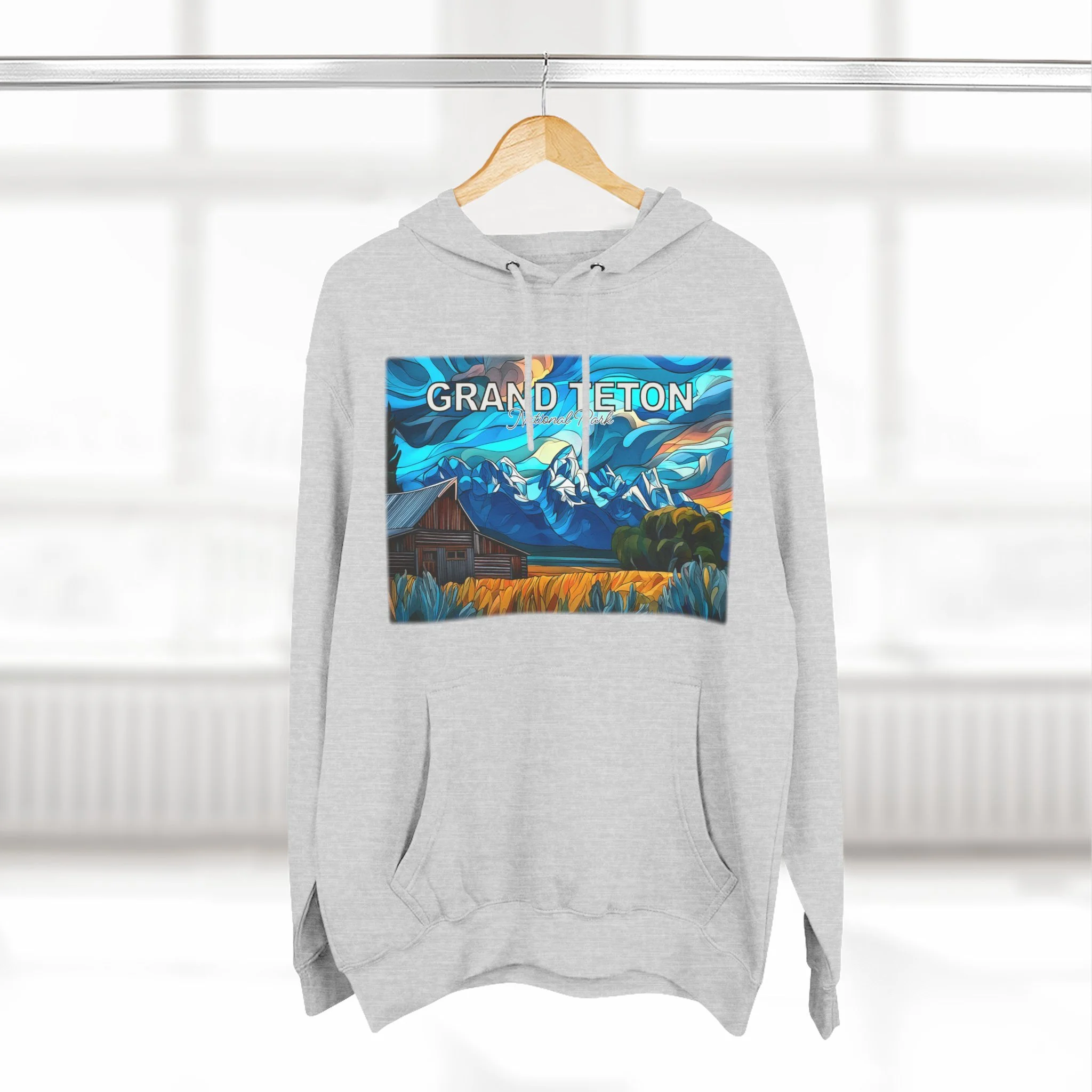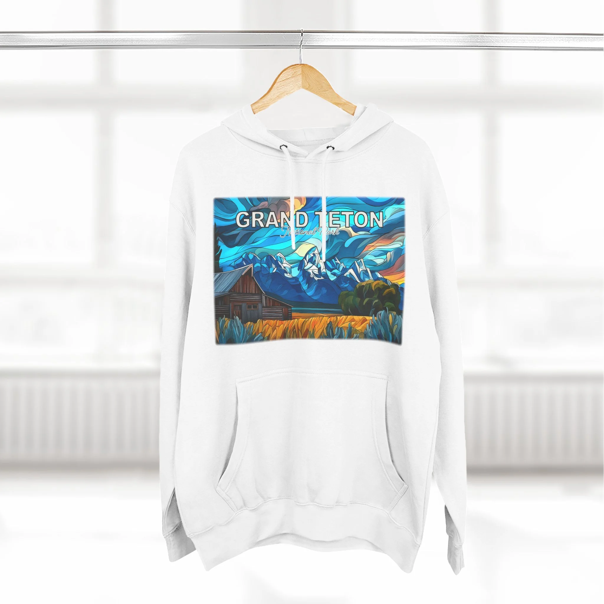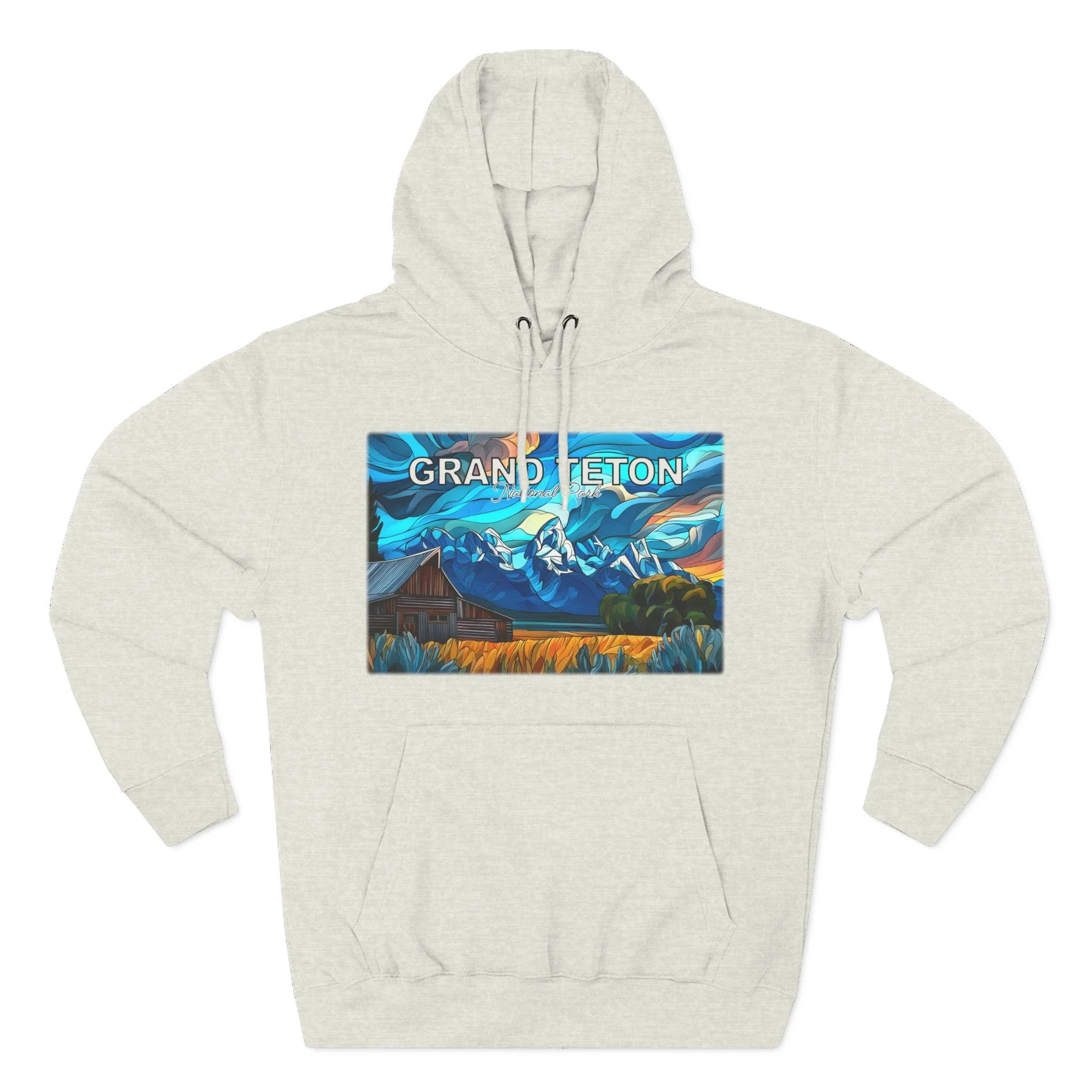 This hoodie goes beyond standard scenic apparel by translating the sunrise atmosphere of Mormons Row into a more elevated, artful design. The composition reflects the contrast between rustic barn forms, broad western land, and mountain silhouettes touched by early light, giving the piece a sense of calm, openness, and emotional depth. The result is wearable art that feels visually distinctive while still being easy to enjoy in everyday life.