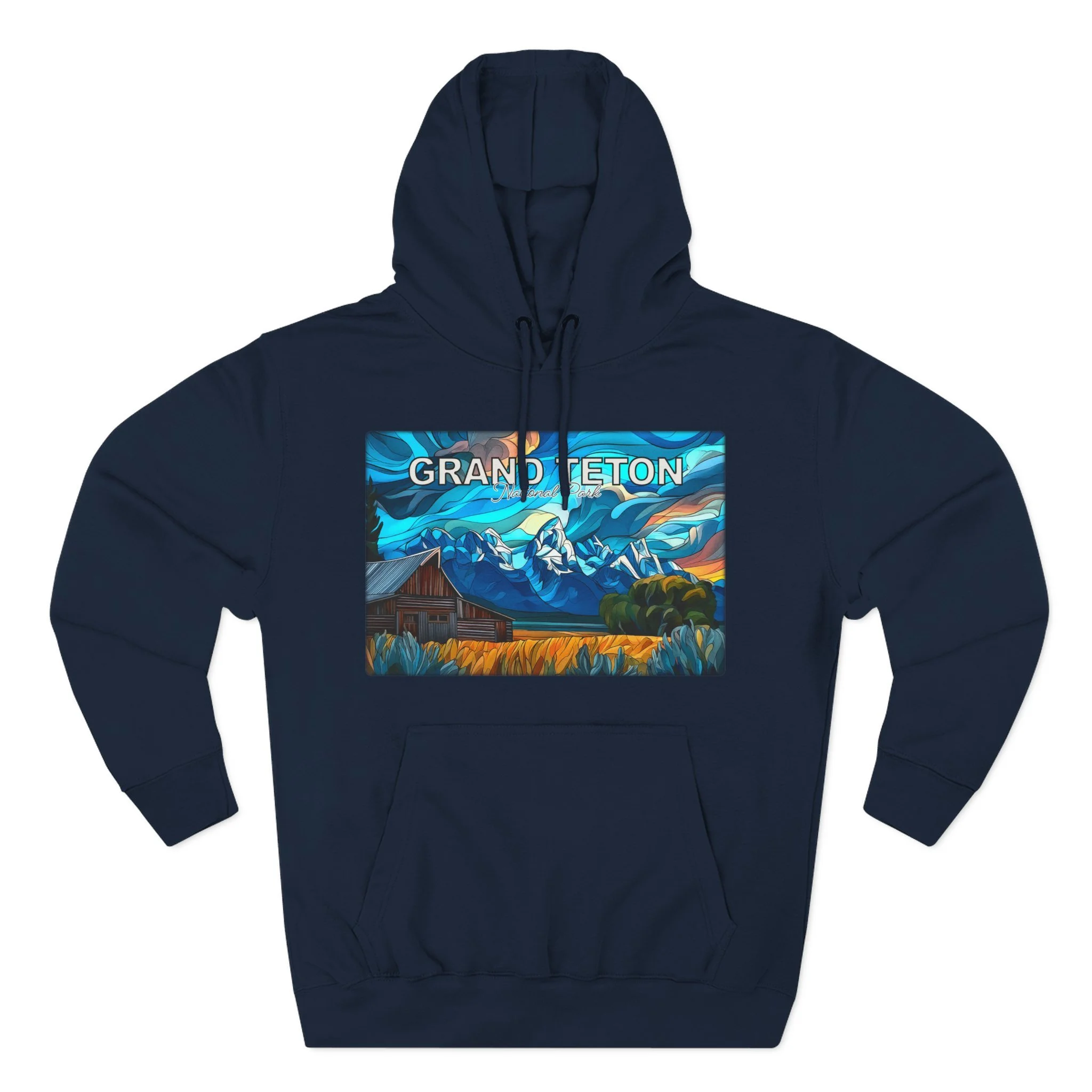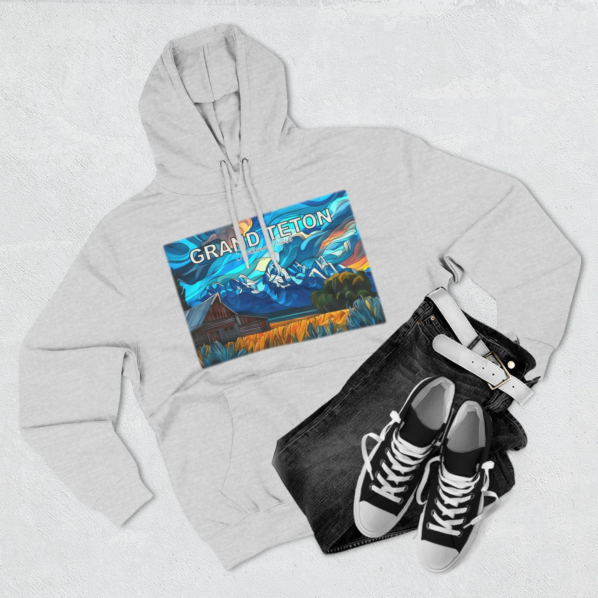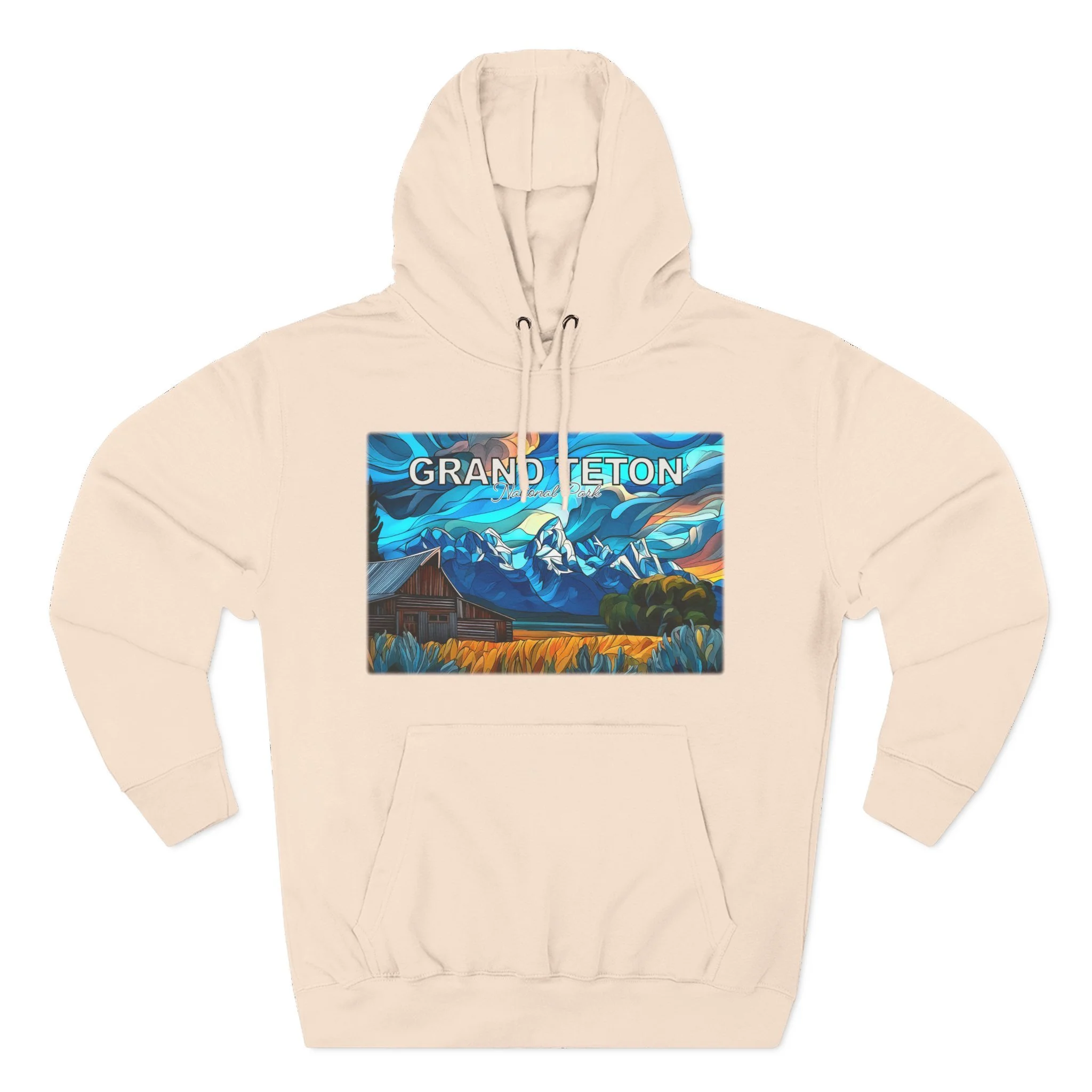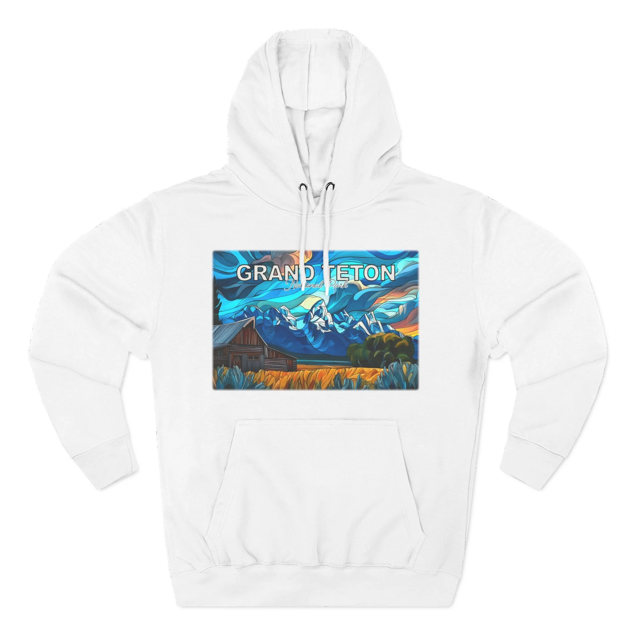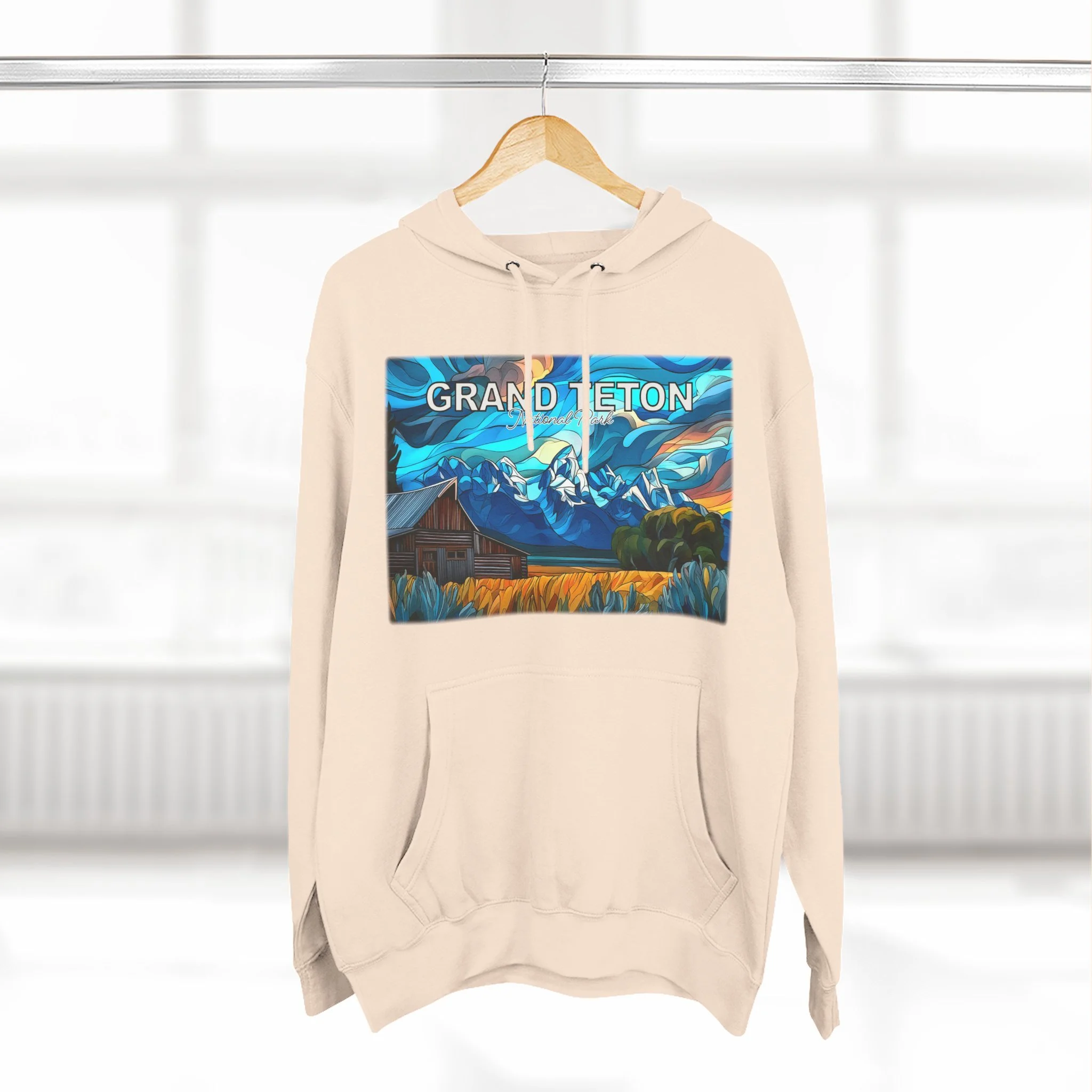 This hoodie goes beyond standard scenic apparel by translating the sunrise atmosphere of Mormons Row into a more elevated, artful design. The composition reflects the contrast between rustic barn forms, broad western land, and mountain silhouettes touched by early light, giving the piece a sense of calm, openness, and emotional depth. The result is wearable art that feels visually distinctive while still being easy to enjoy in everyday life.