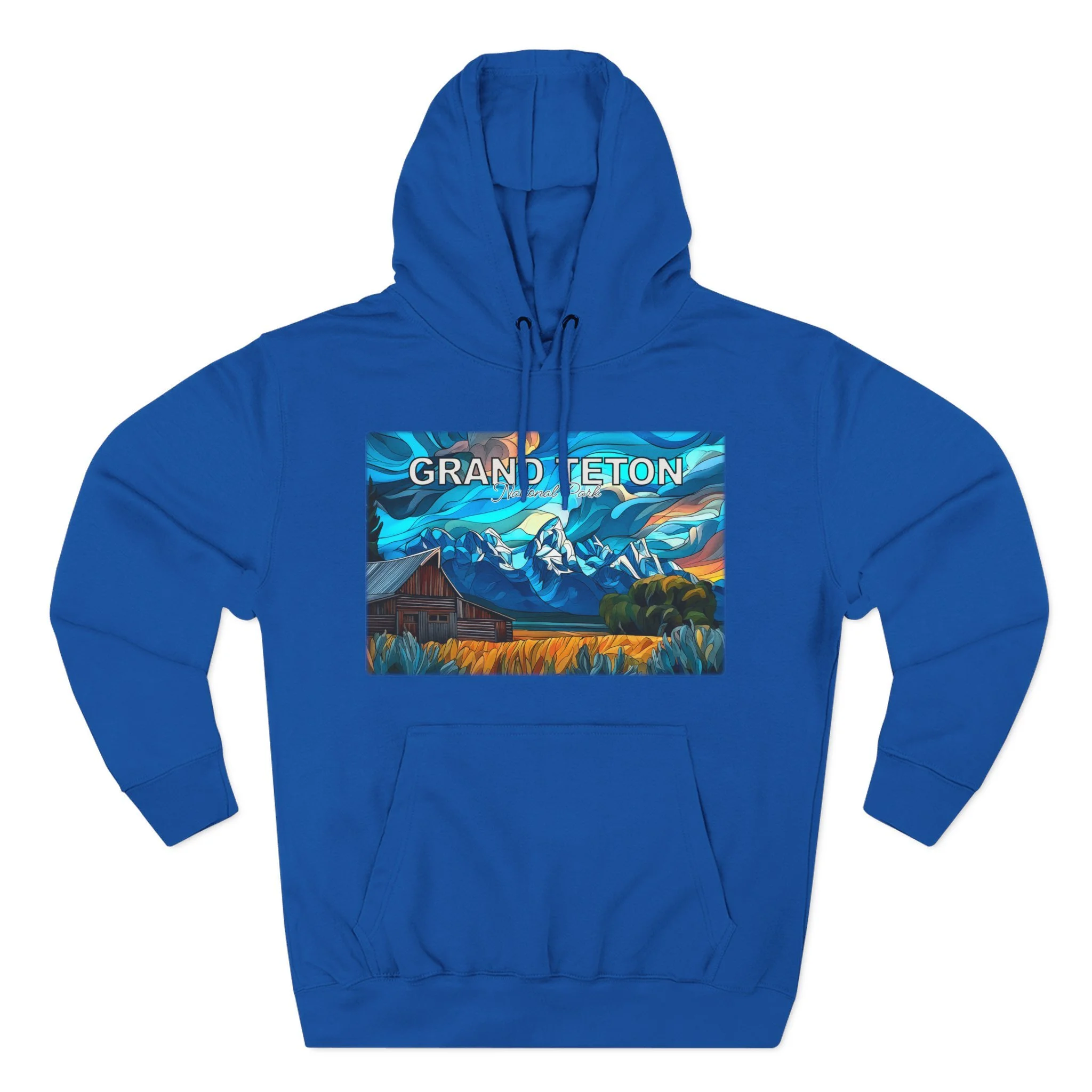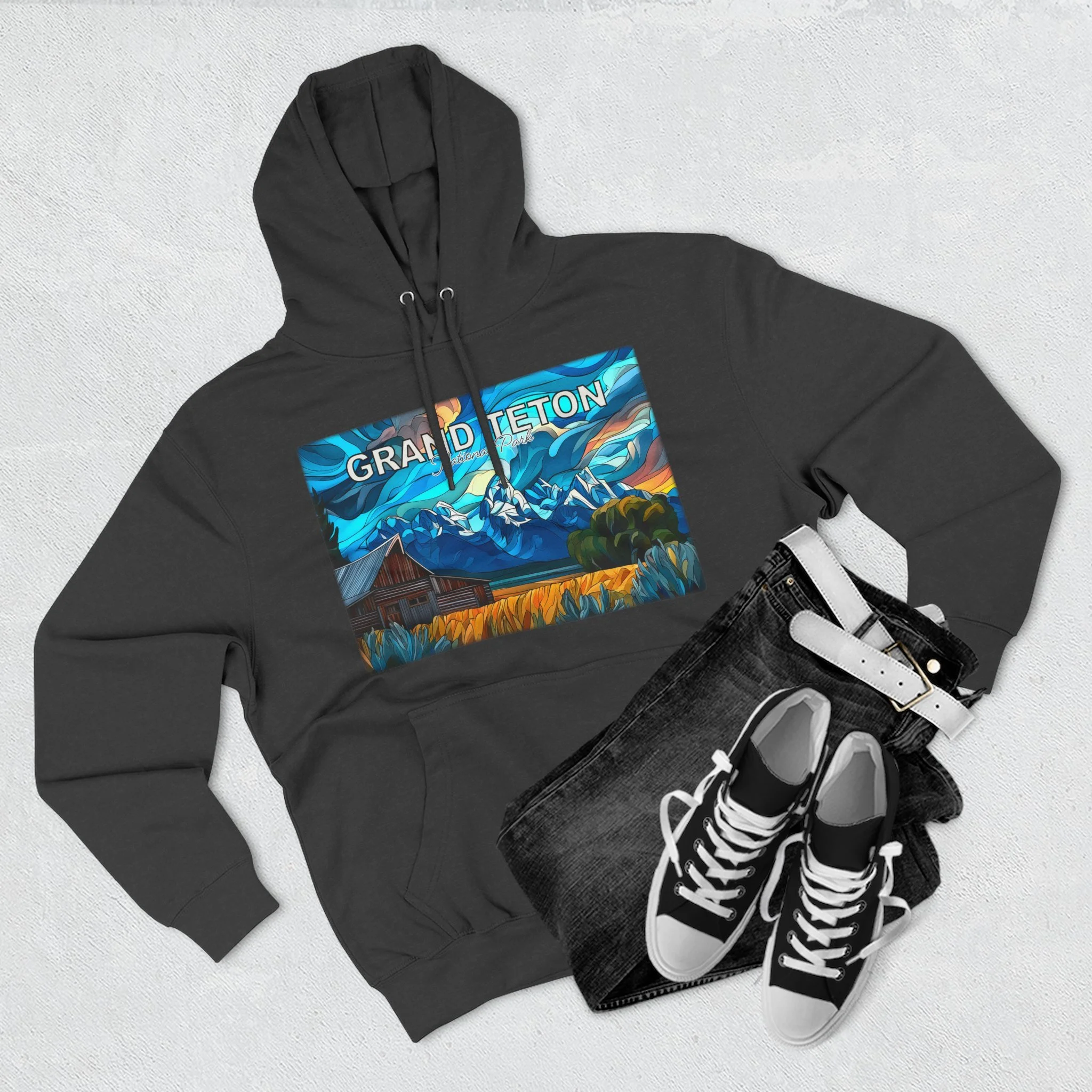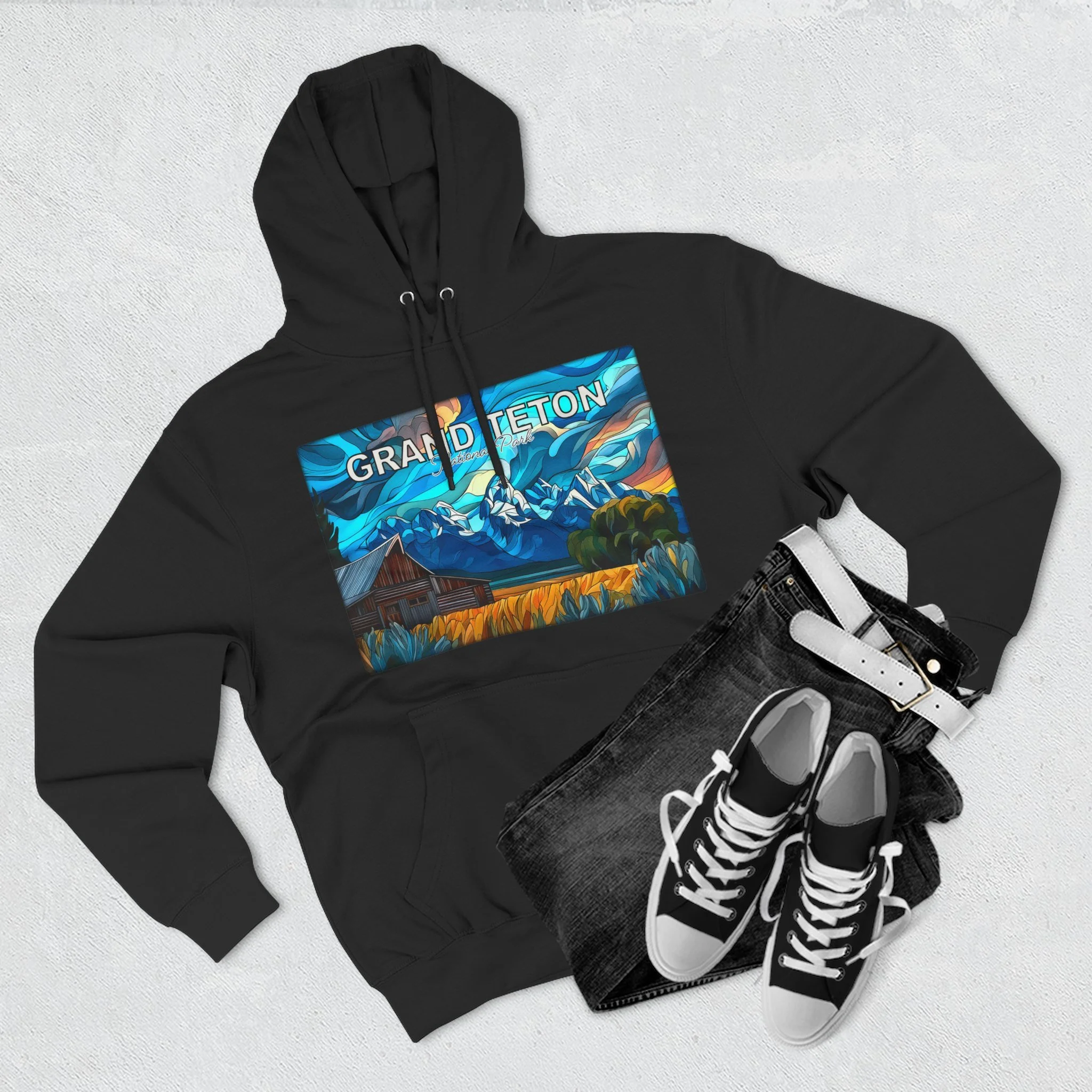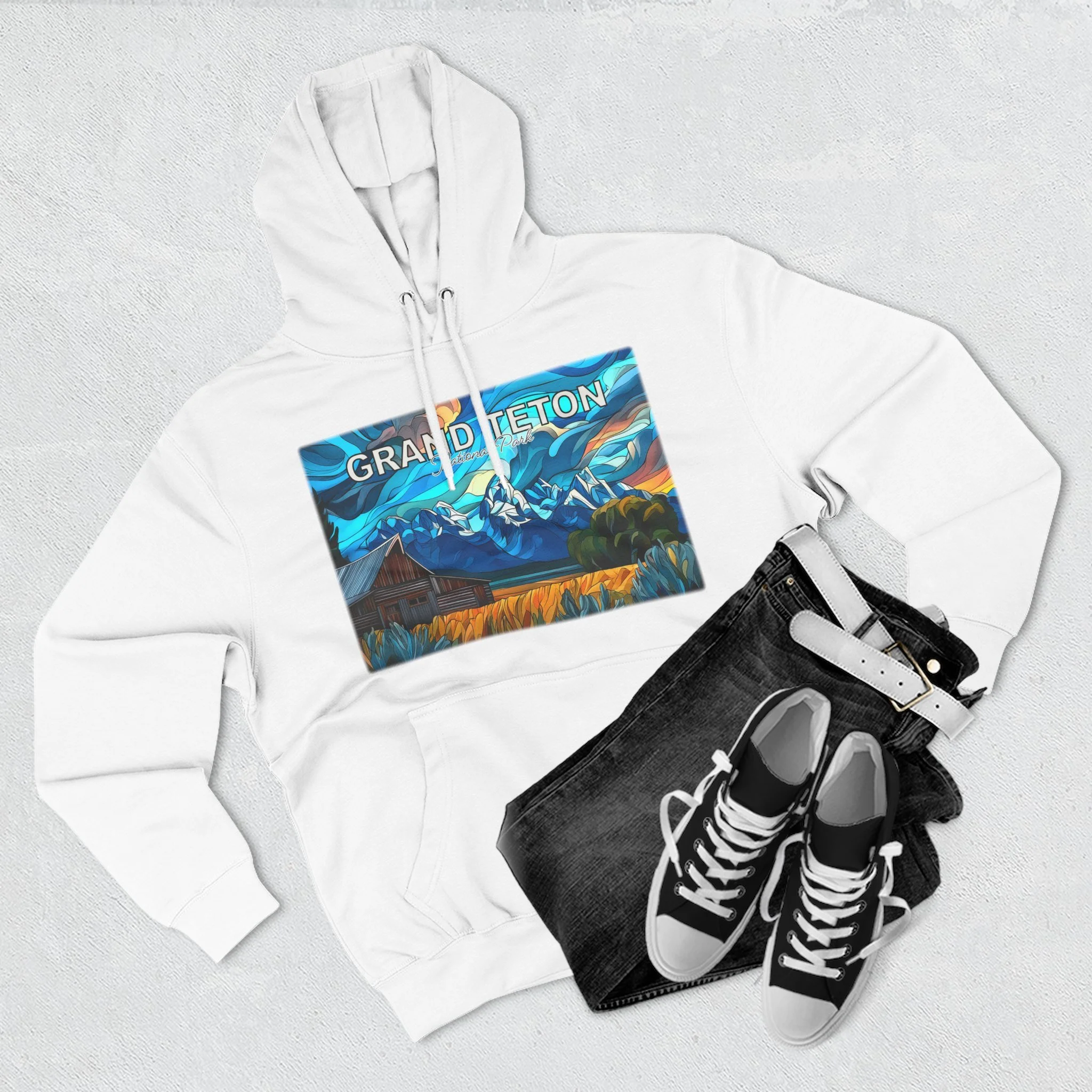 This hoodie goes beyond standard scenic apparel by translating the sunrise atmosphere of Mormons Row into a more elevated, artful design. The composition reflects the contrast between rustic barn forms, broad western land, and mountain silhouettes touched by early light, giving the piece a sense of calm, openness, and emotional depth. The result is wearable art that feels visually distinctive while still being easy to enjoy in everyday life.
