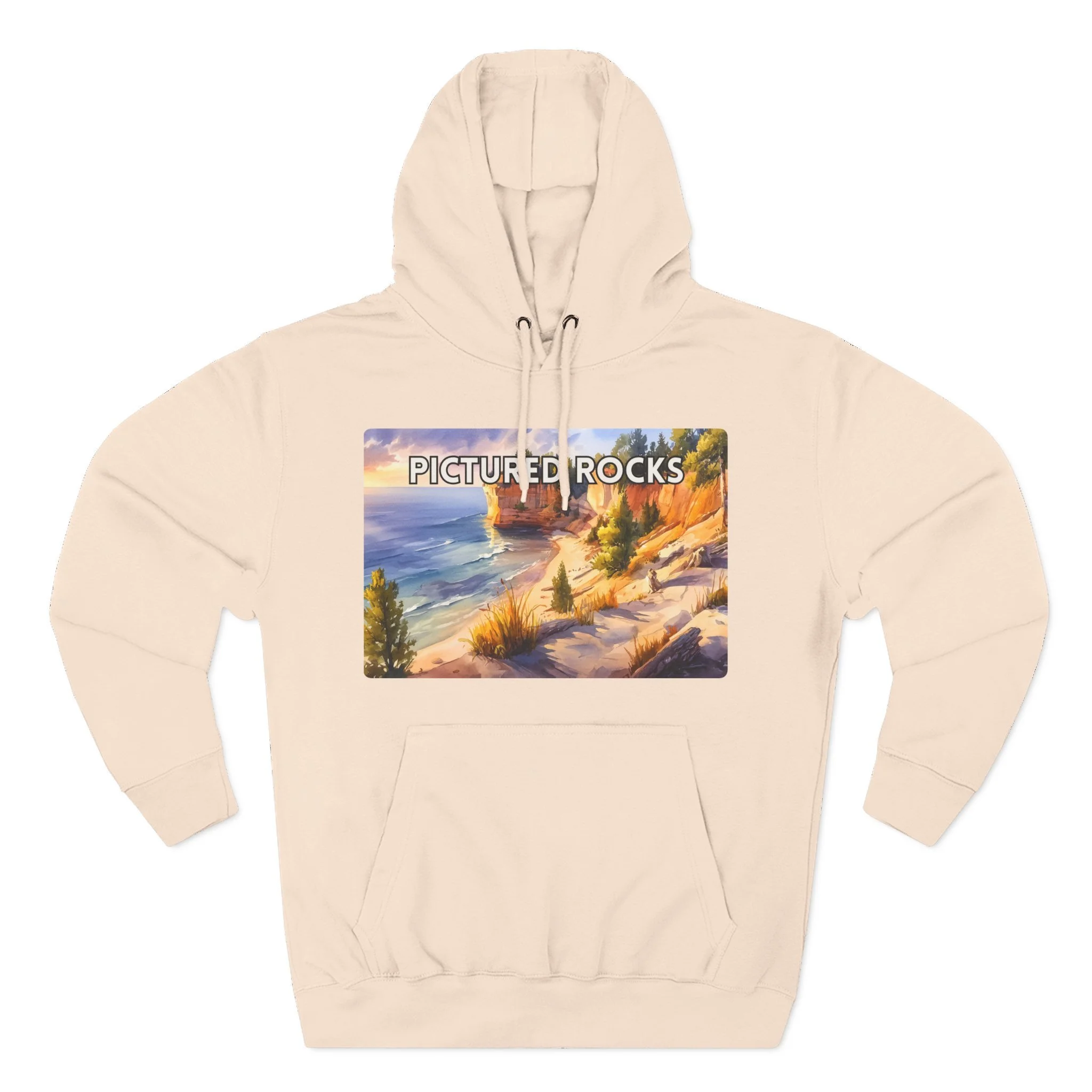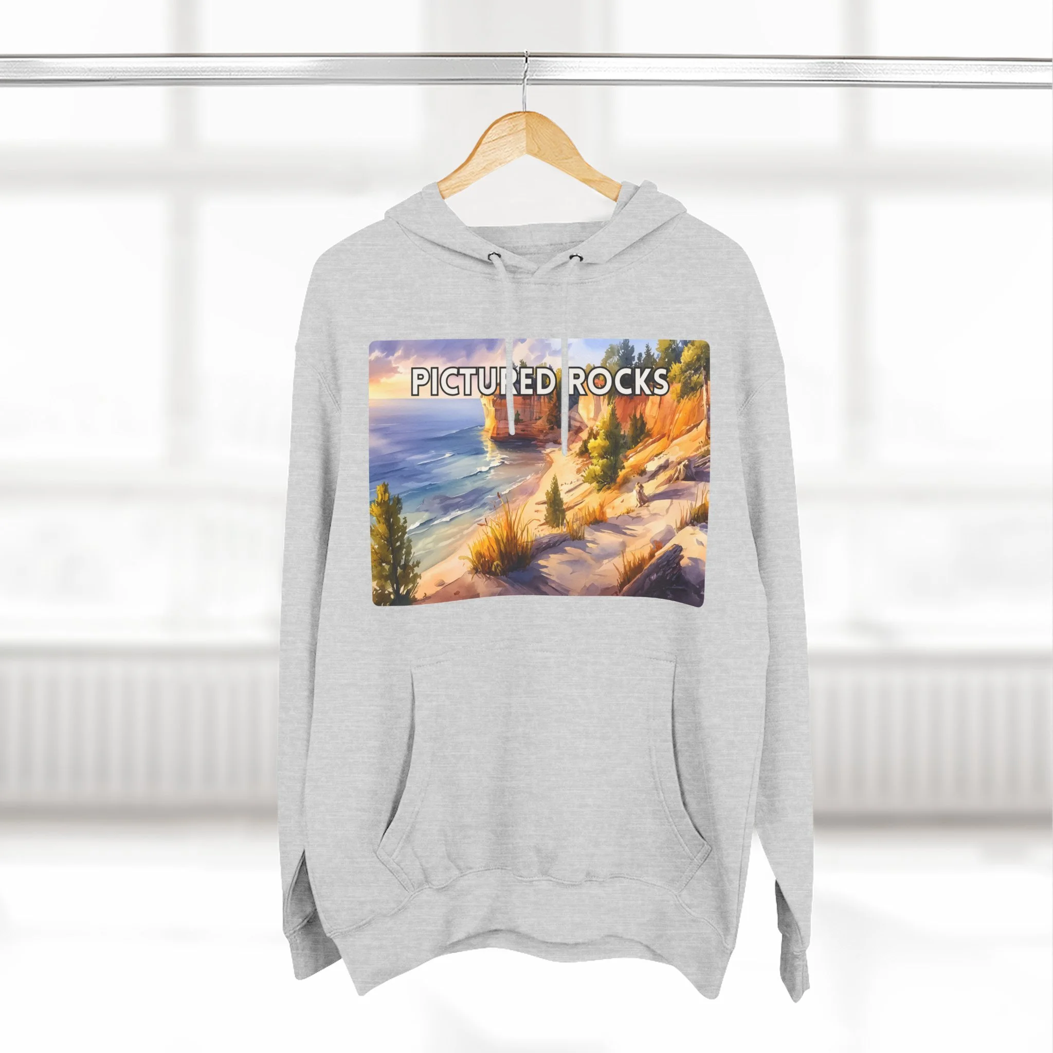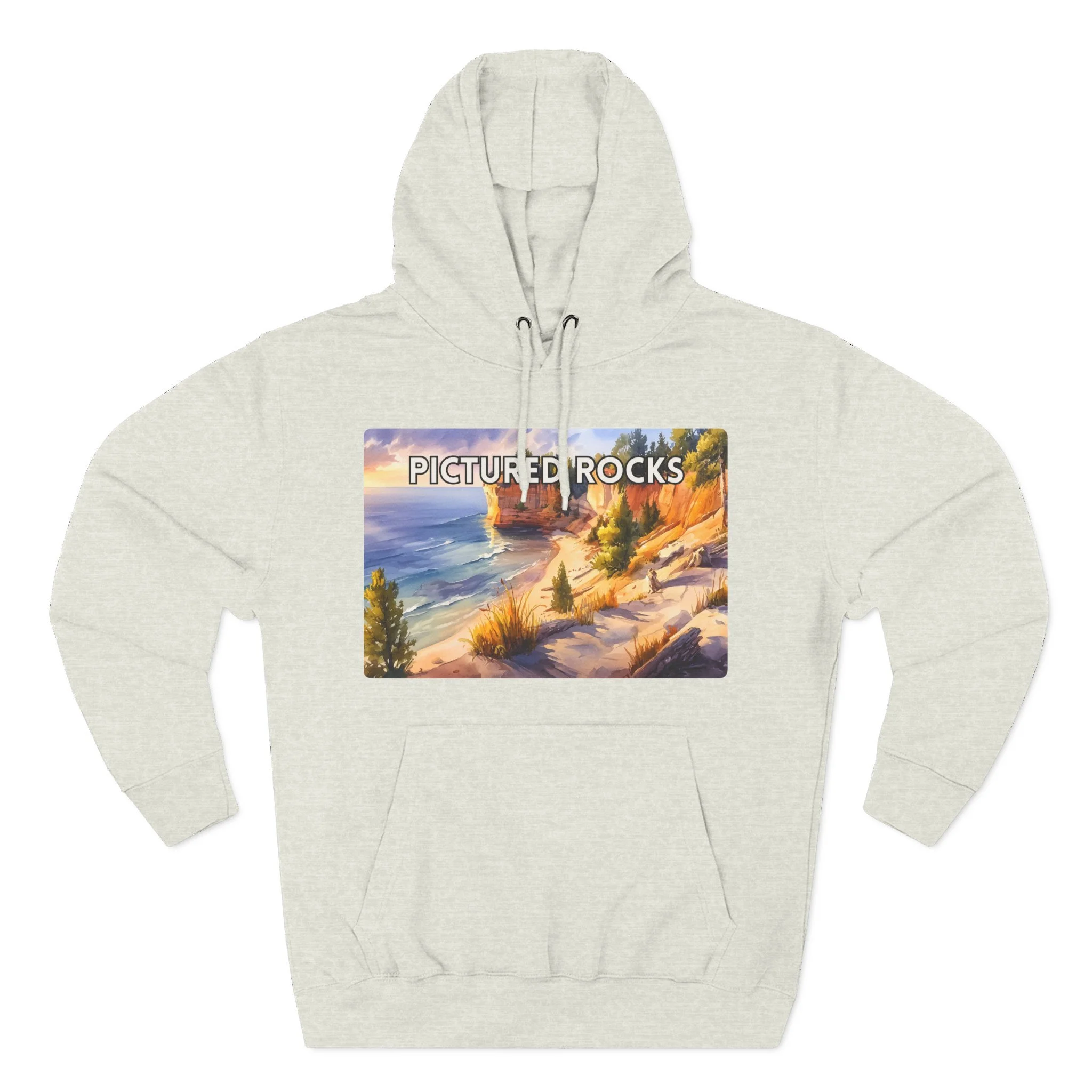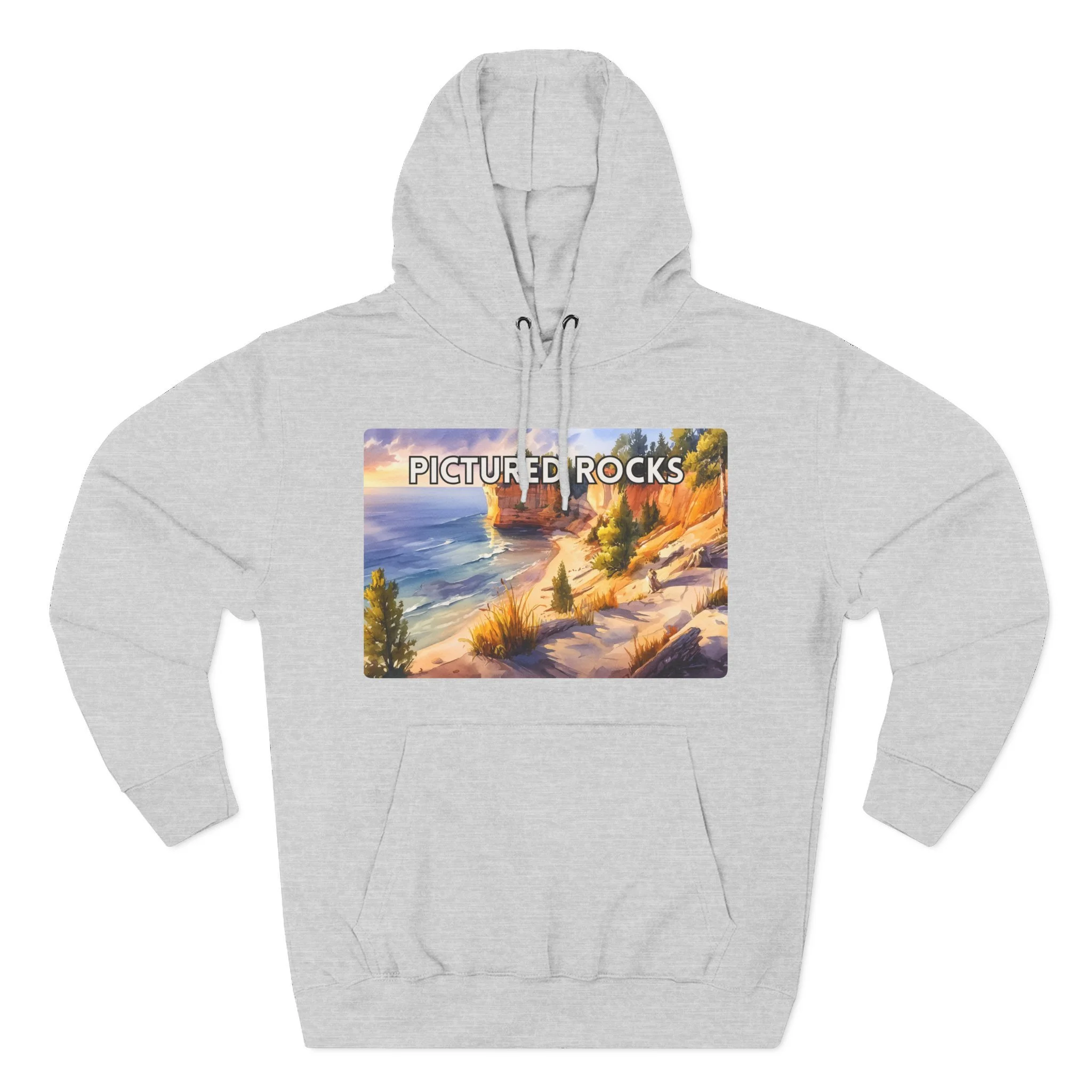 Experience the glow of golden hour at Pictured Rocks with this Sunset Watercolor Hoodie. Featuring a soft, painterly depiction of Lake Superior’s sandstone cliffs lit by warm evening light, the design brings together natural beauty and artistic elegance. Printed on a cozy cotton-poly blend, this unisex hoodie is perfect for sunset hikes, lakeside bonfires, or relaxed indoor wear. A must-have for lovers of scenic landscapes and tranquil moments in nature.