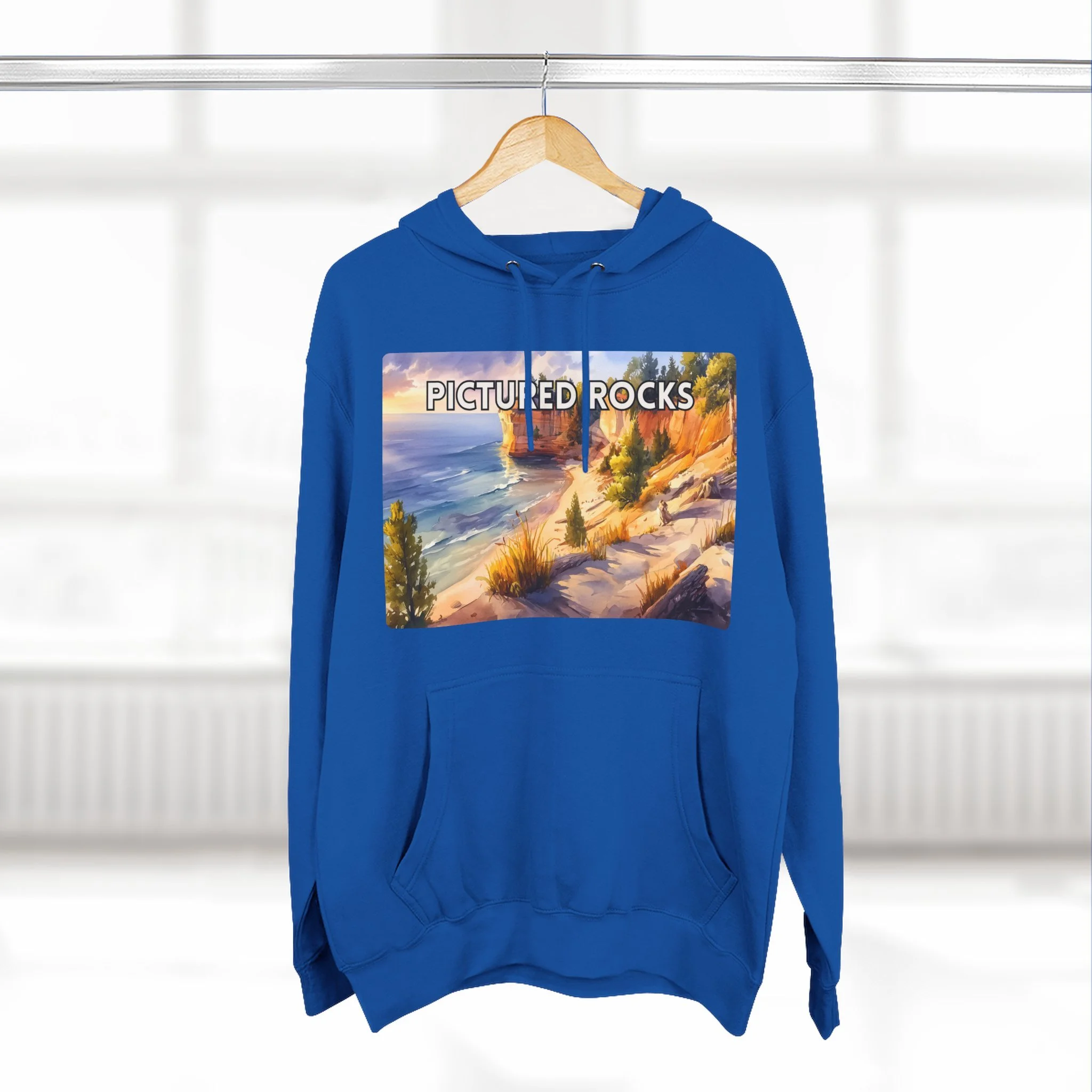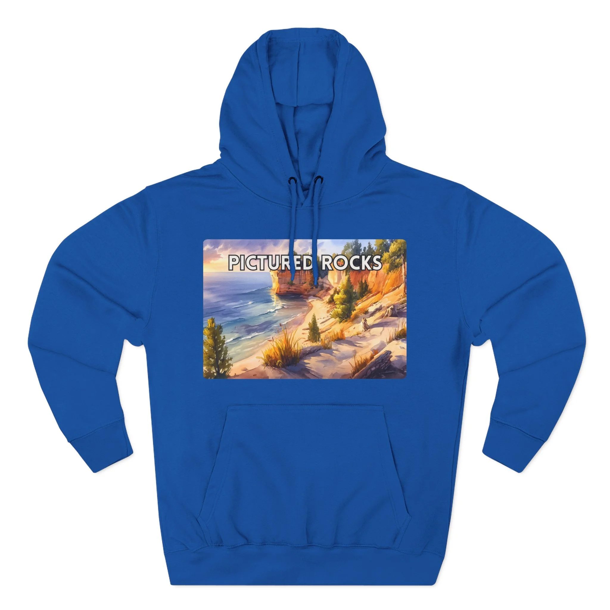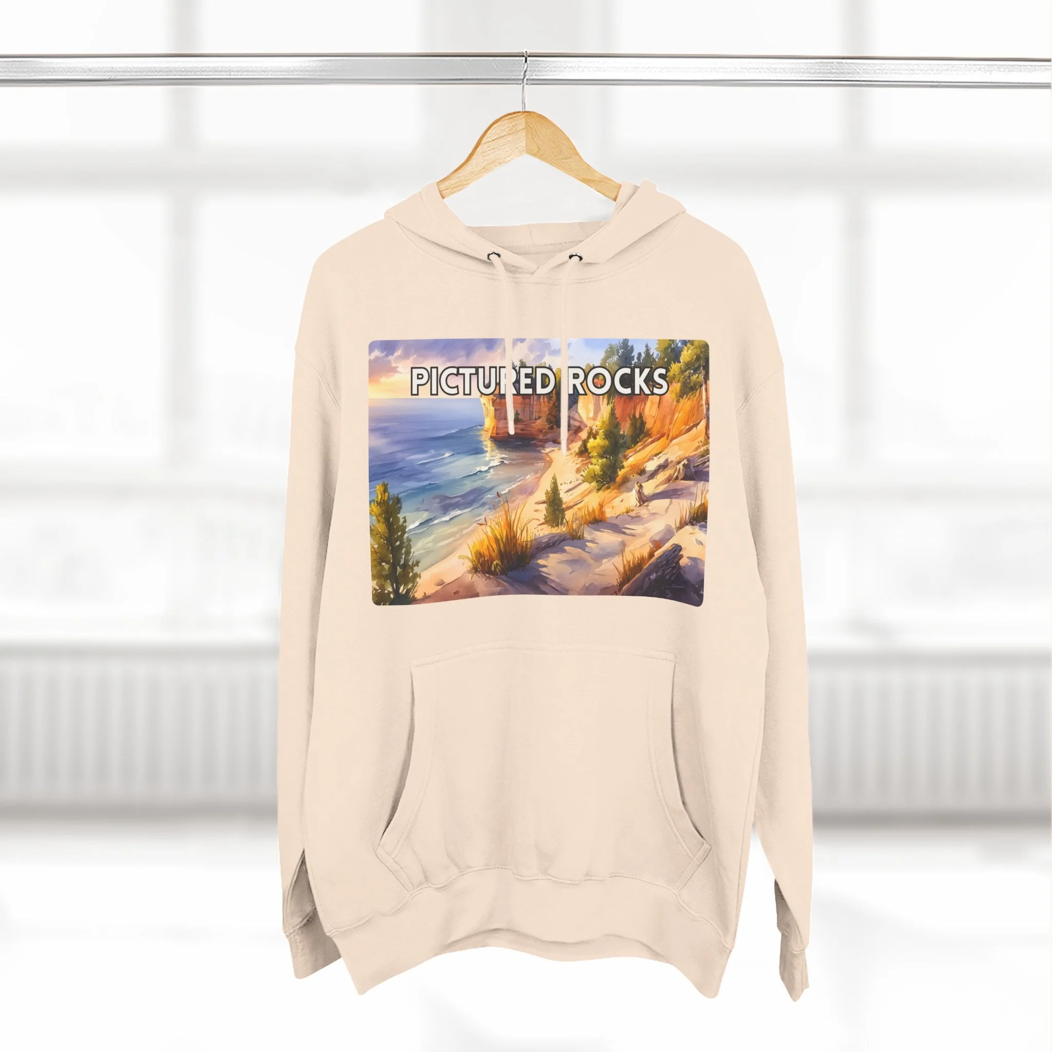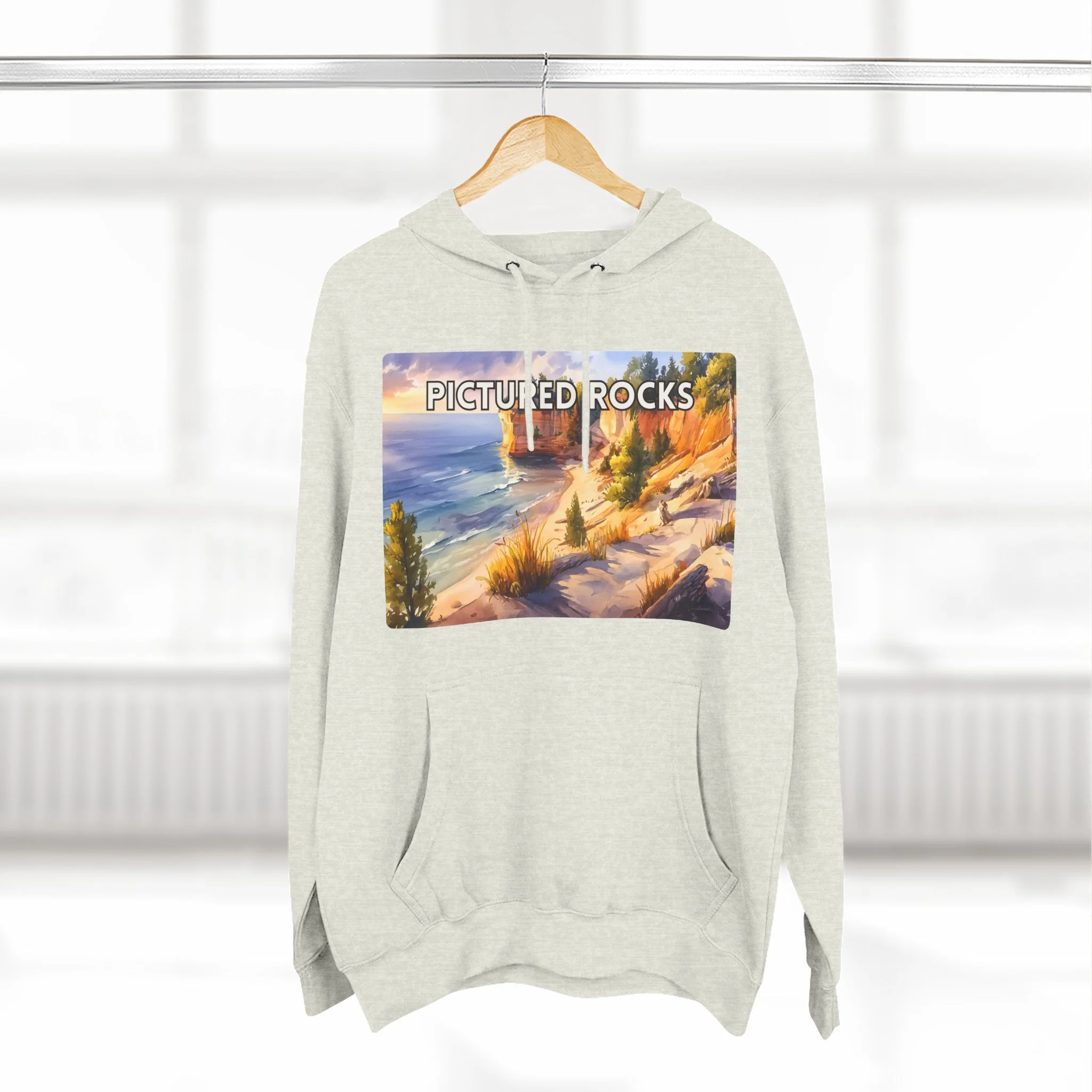 Experience the glow of golden hour at Pictured Rocks with this Sunset Watercolor Hoodie. Featuring a soft, painterly depiction of Lake Superior’s sandstone cliffs lit by warm evening light, the design brings together natural beauty and artistic elegance. Printed on a cozy cotton-poly blend, this unisex hoodie is perfect for sunset hikes, lakeside bonfires, or relaxed indoor wear. A must-have for lovers of scenic landscapes and tranquil moments in nature.
