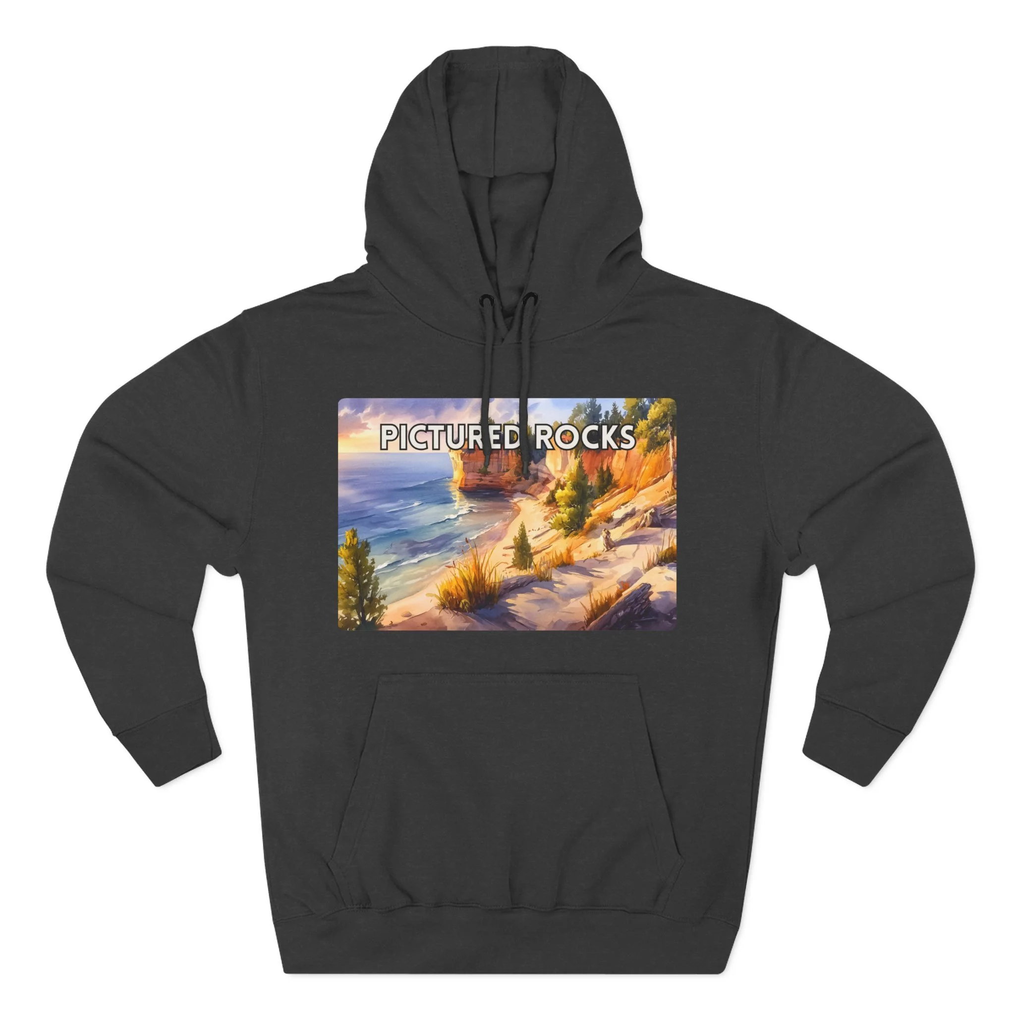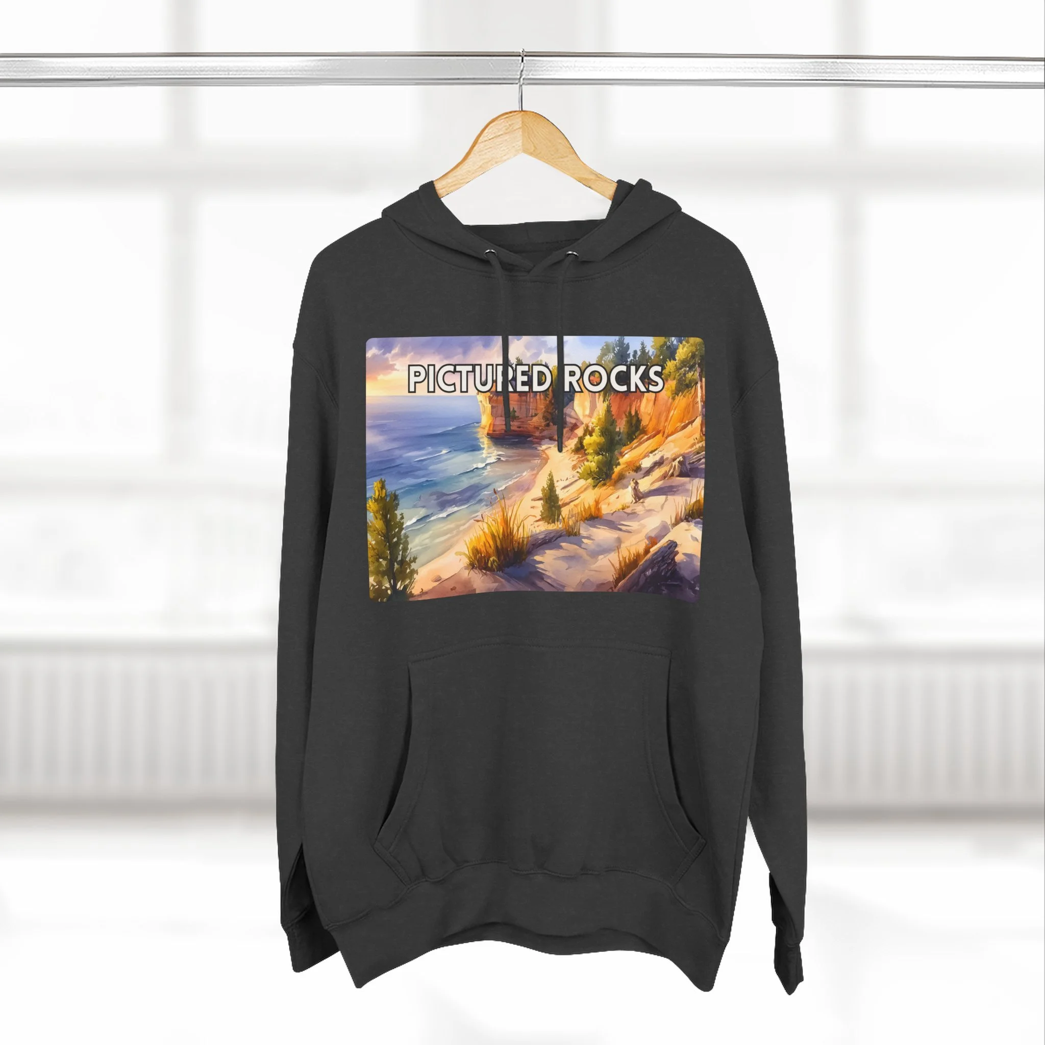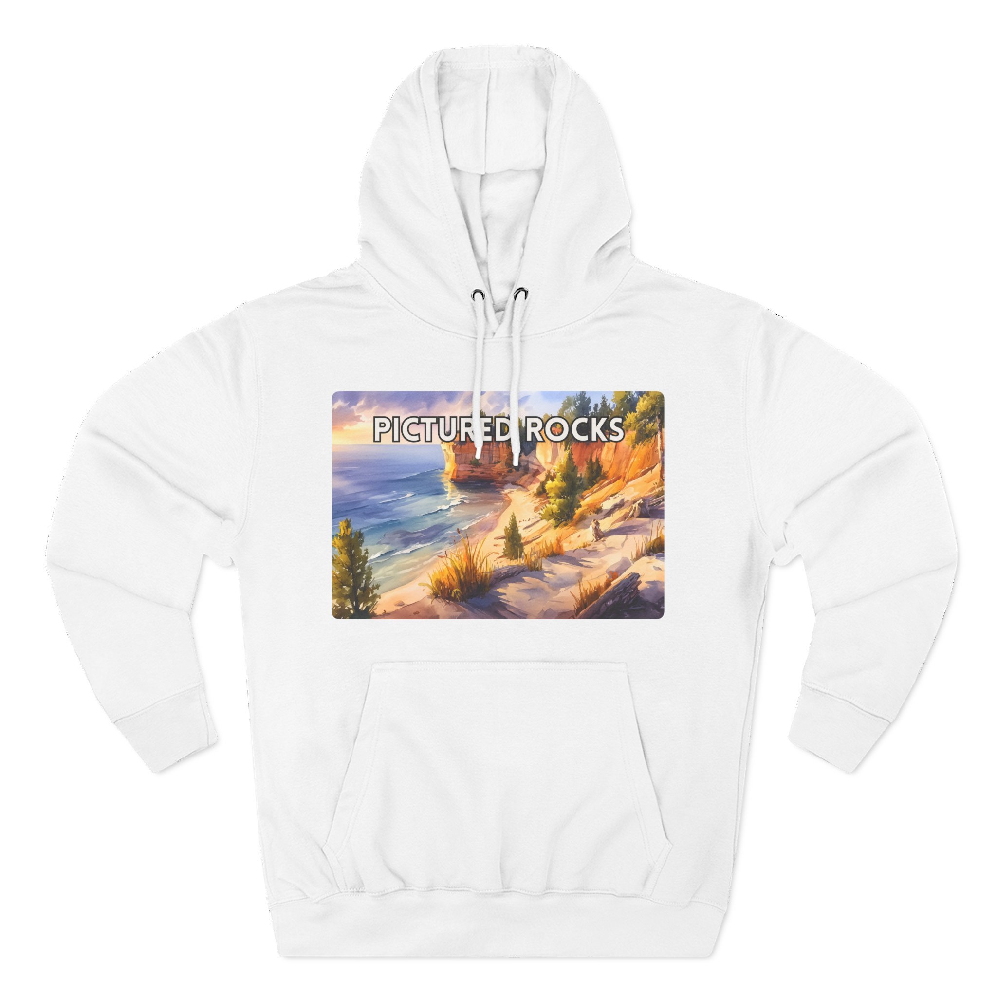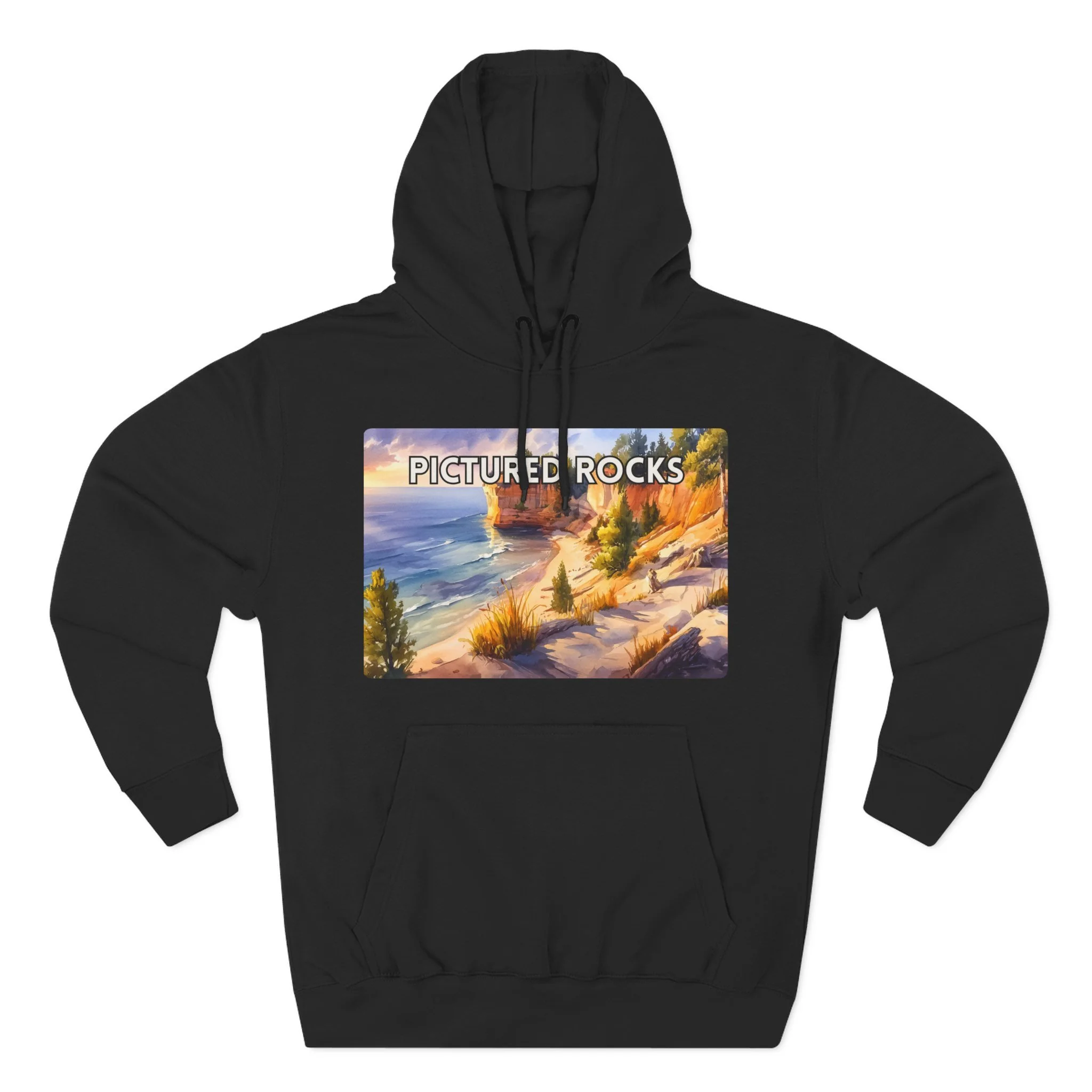 Pictured Rocks Sunset Hoodie – Watercolor Lakeshore Pullover Sweatshirt with Cliff and Evening Sky Art