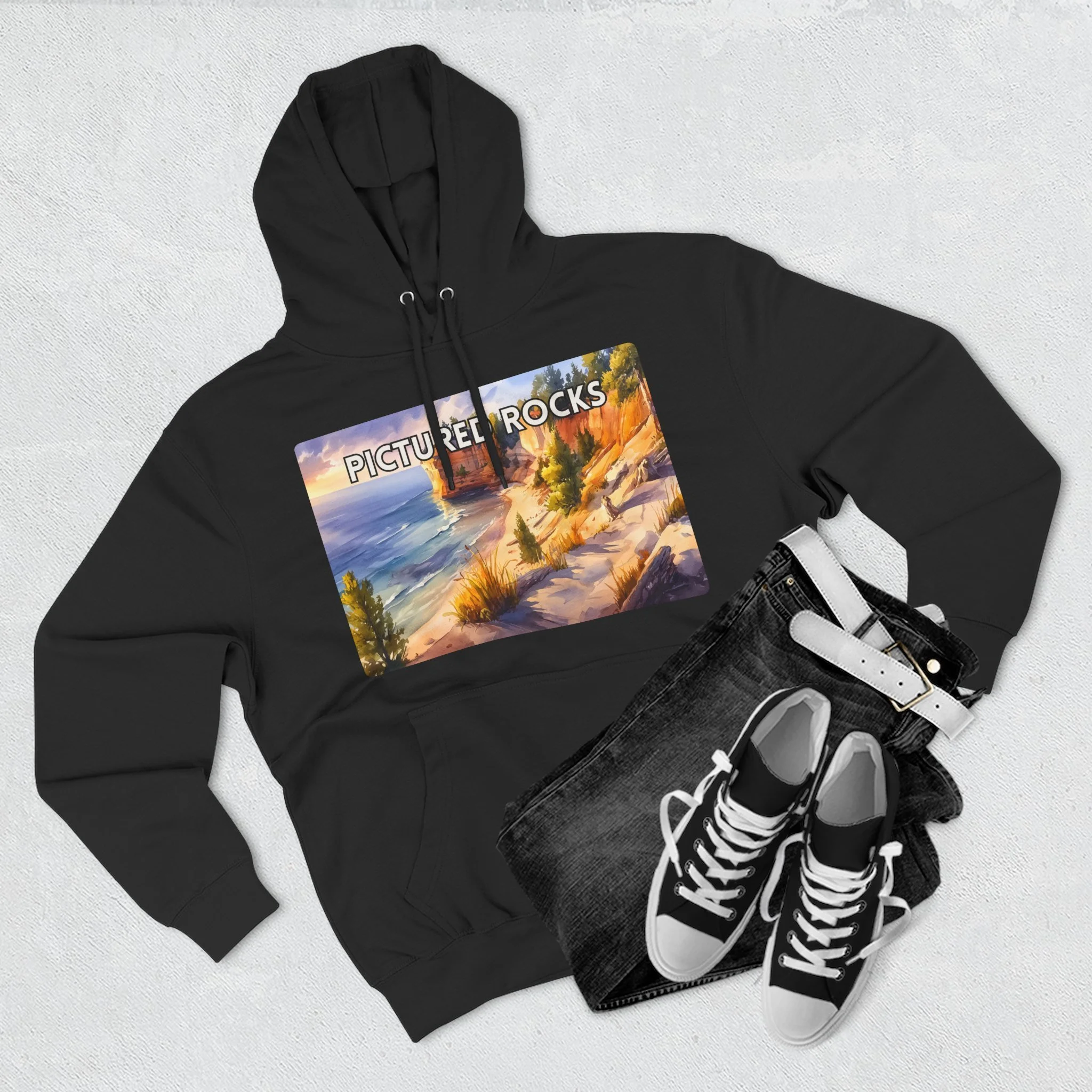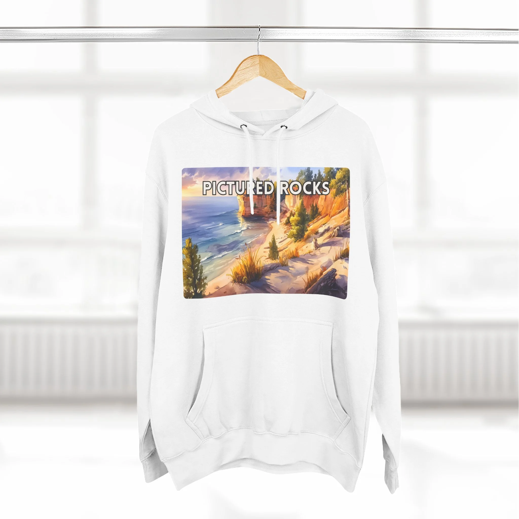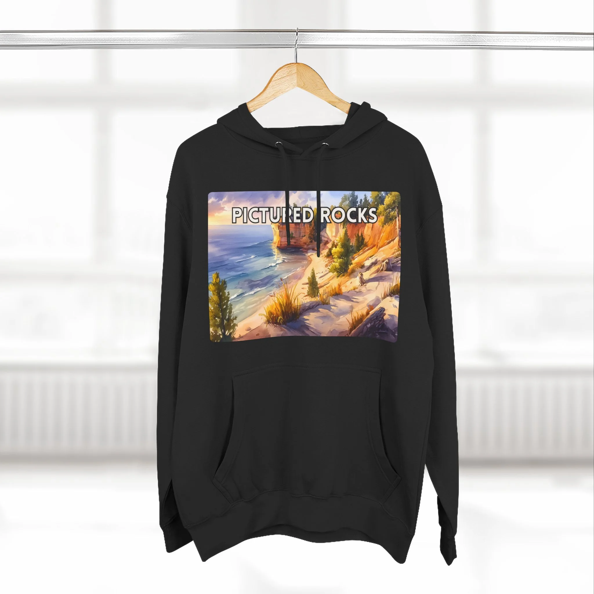 Pictured Rocks Sunset Hoodie – Watercolor Lakeshore Pullover Sweatshirt with Cliff and Evening Sky Art