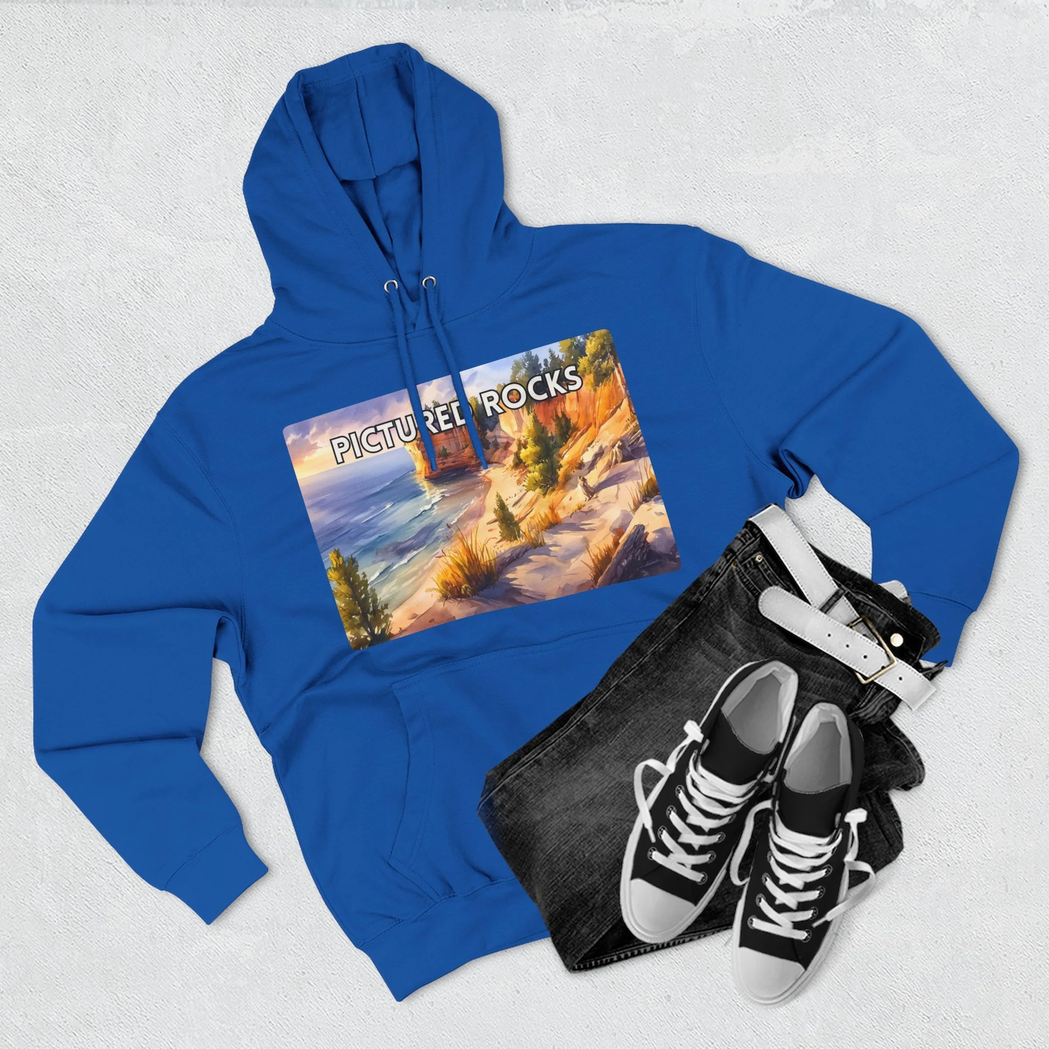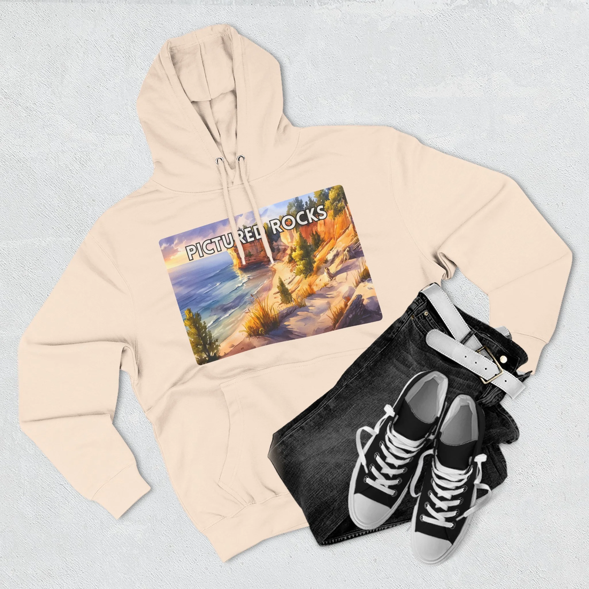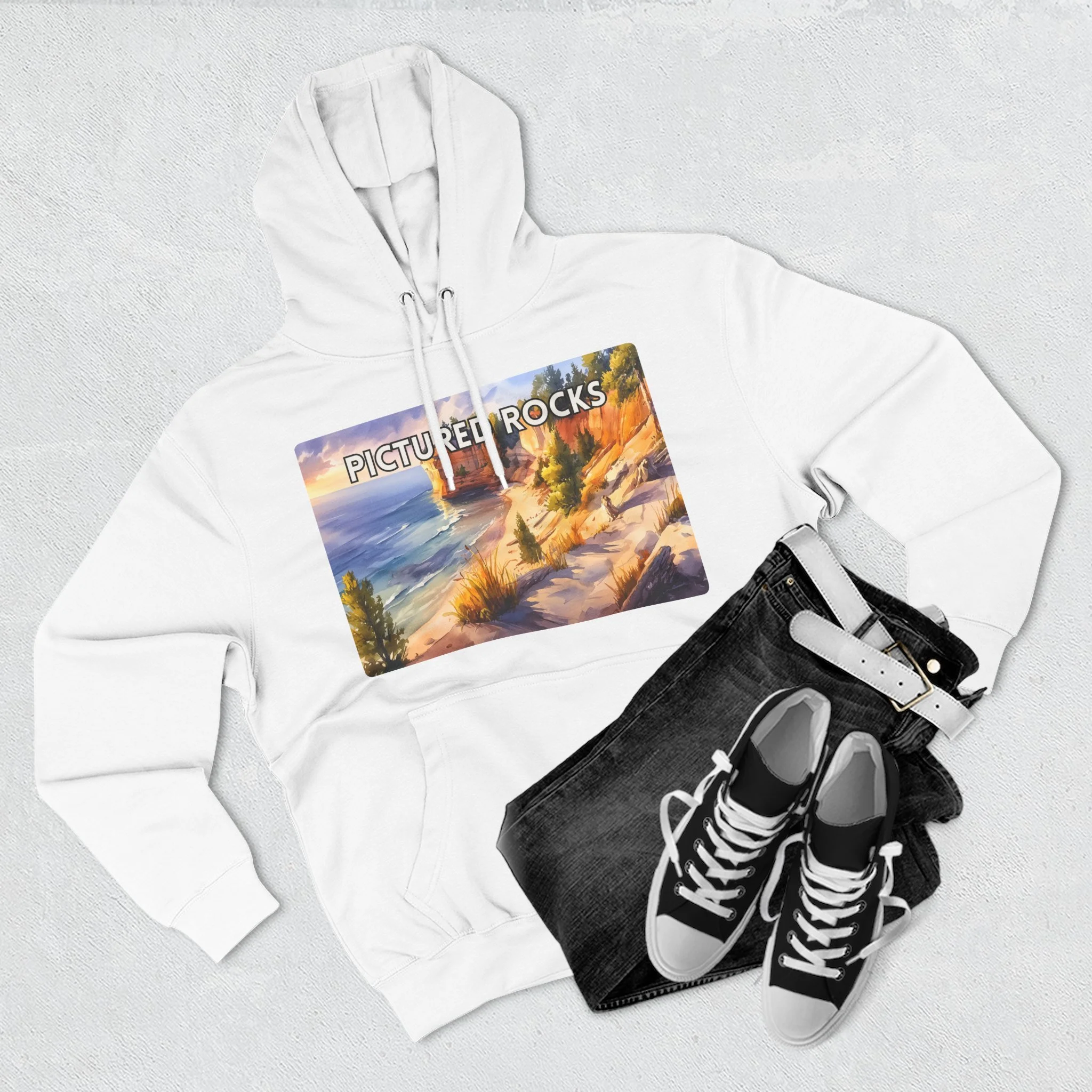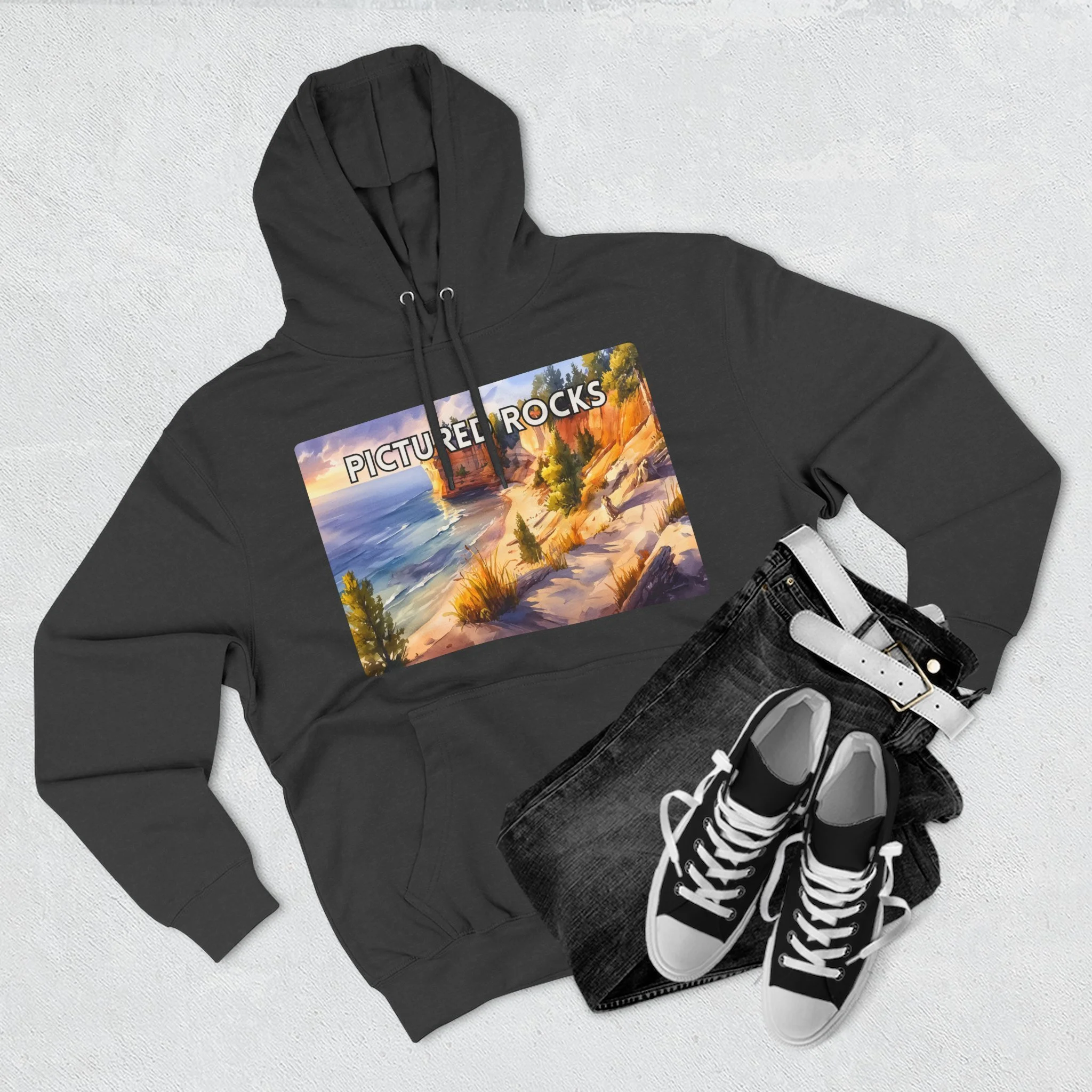 Pictured Rocks Sunset Hoodie – Watercolor Lakeshore Pullover Sweatshirt with Cliff and Evening Sky Art