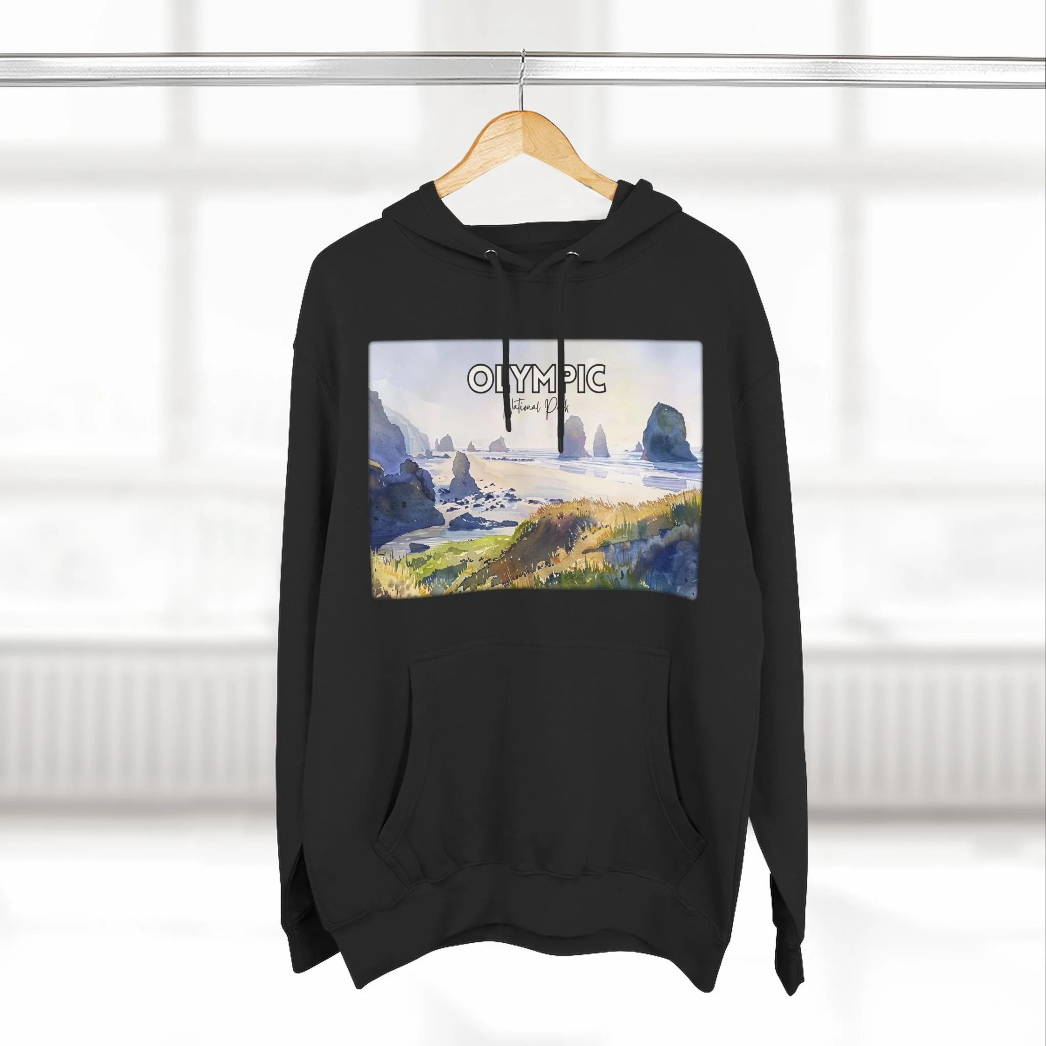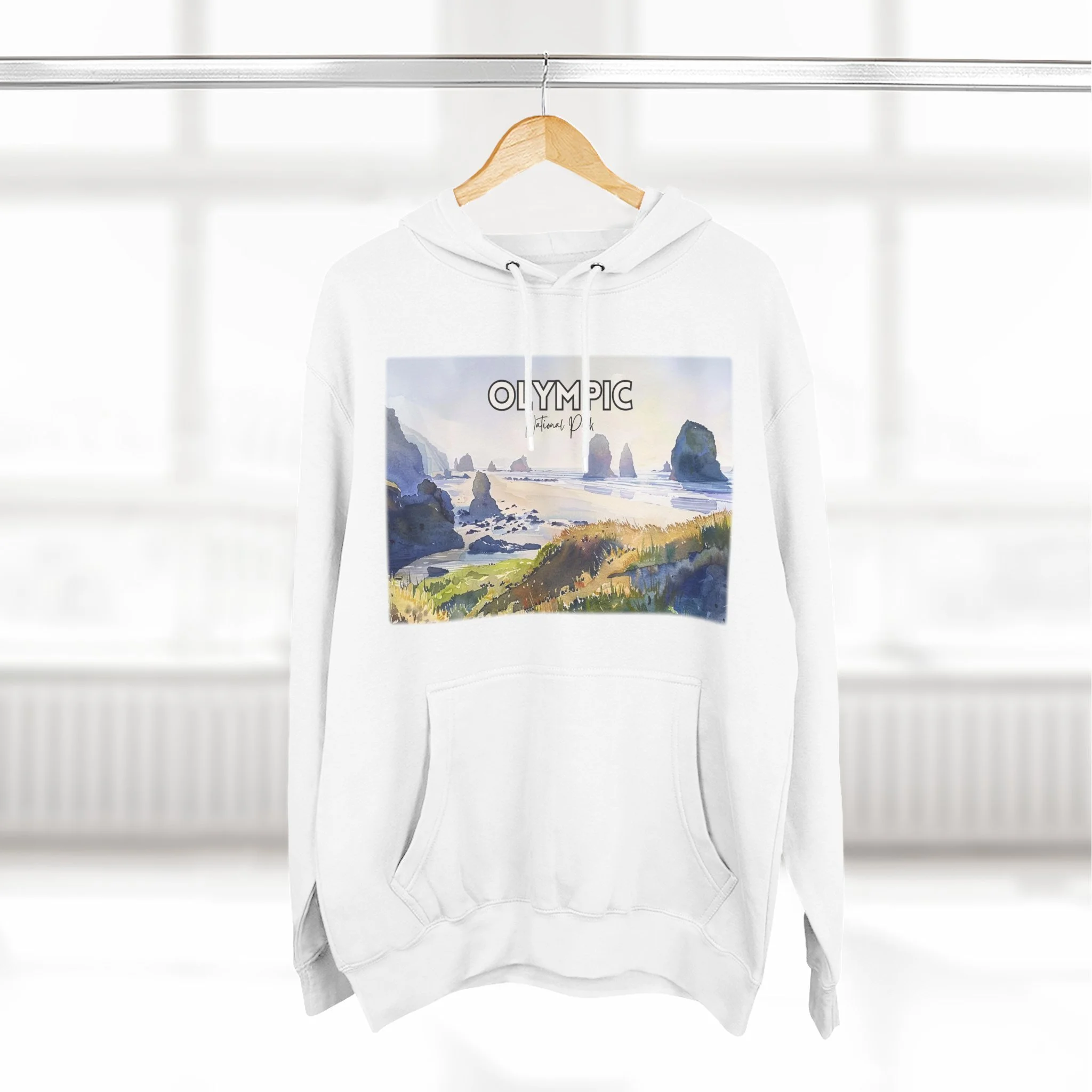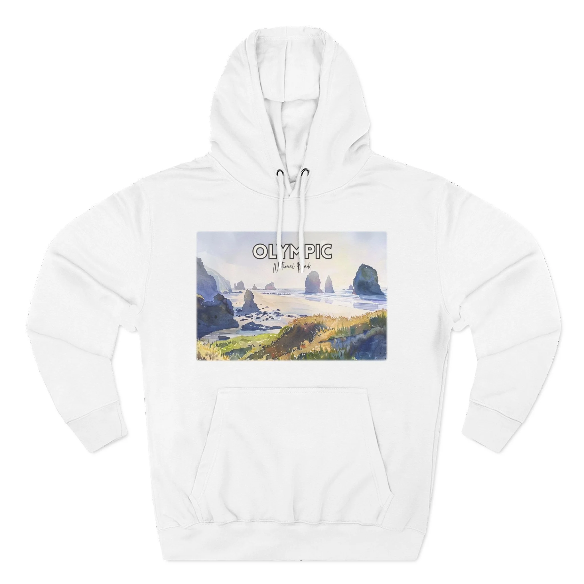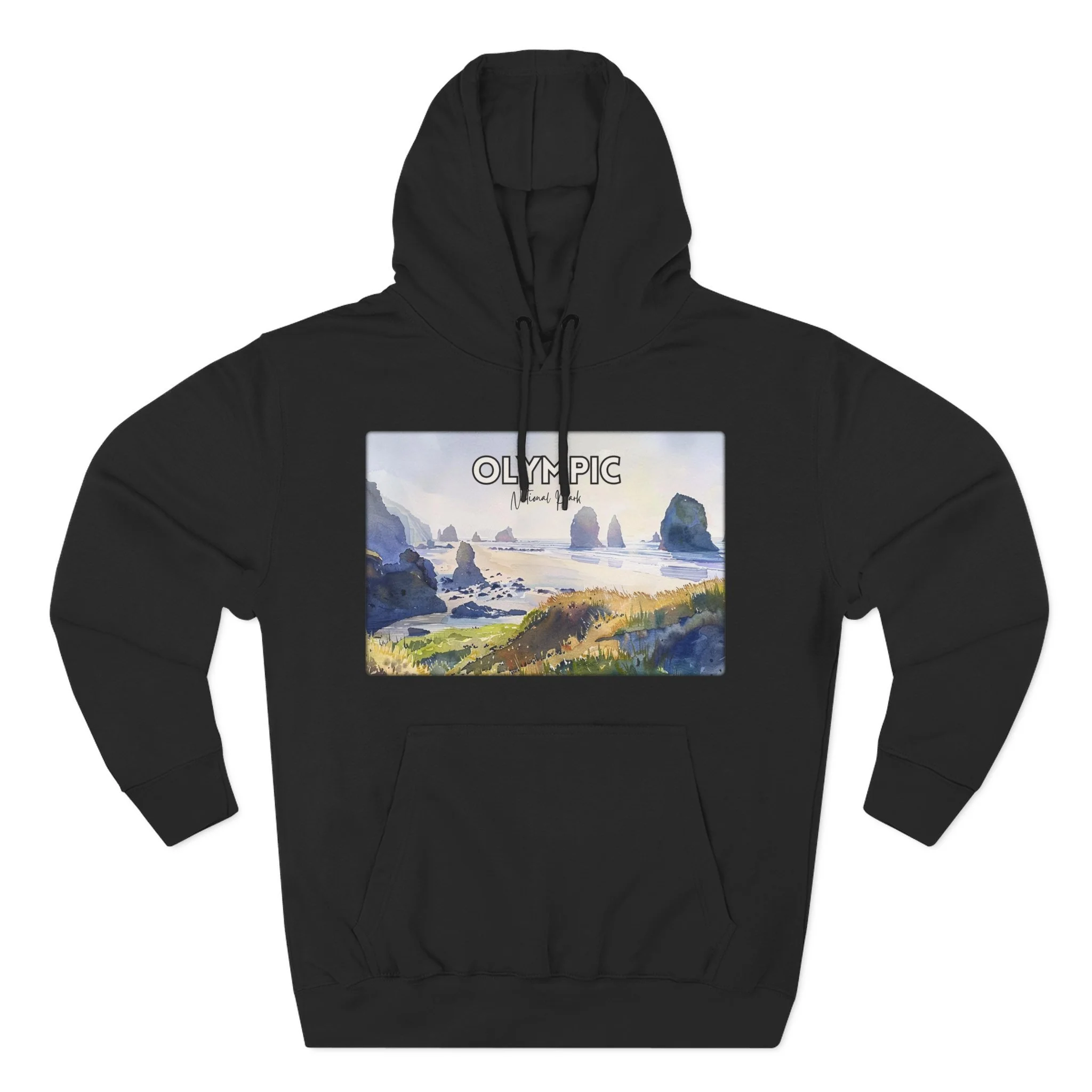 Shi Shi Beach Hoodie – Olympic National Park Watercolor Pullover with Coastal Cliff and Ocean Artwork