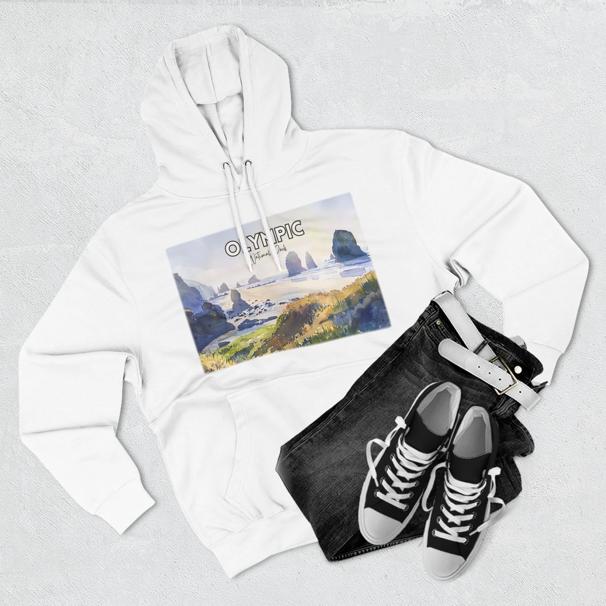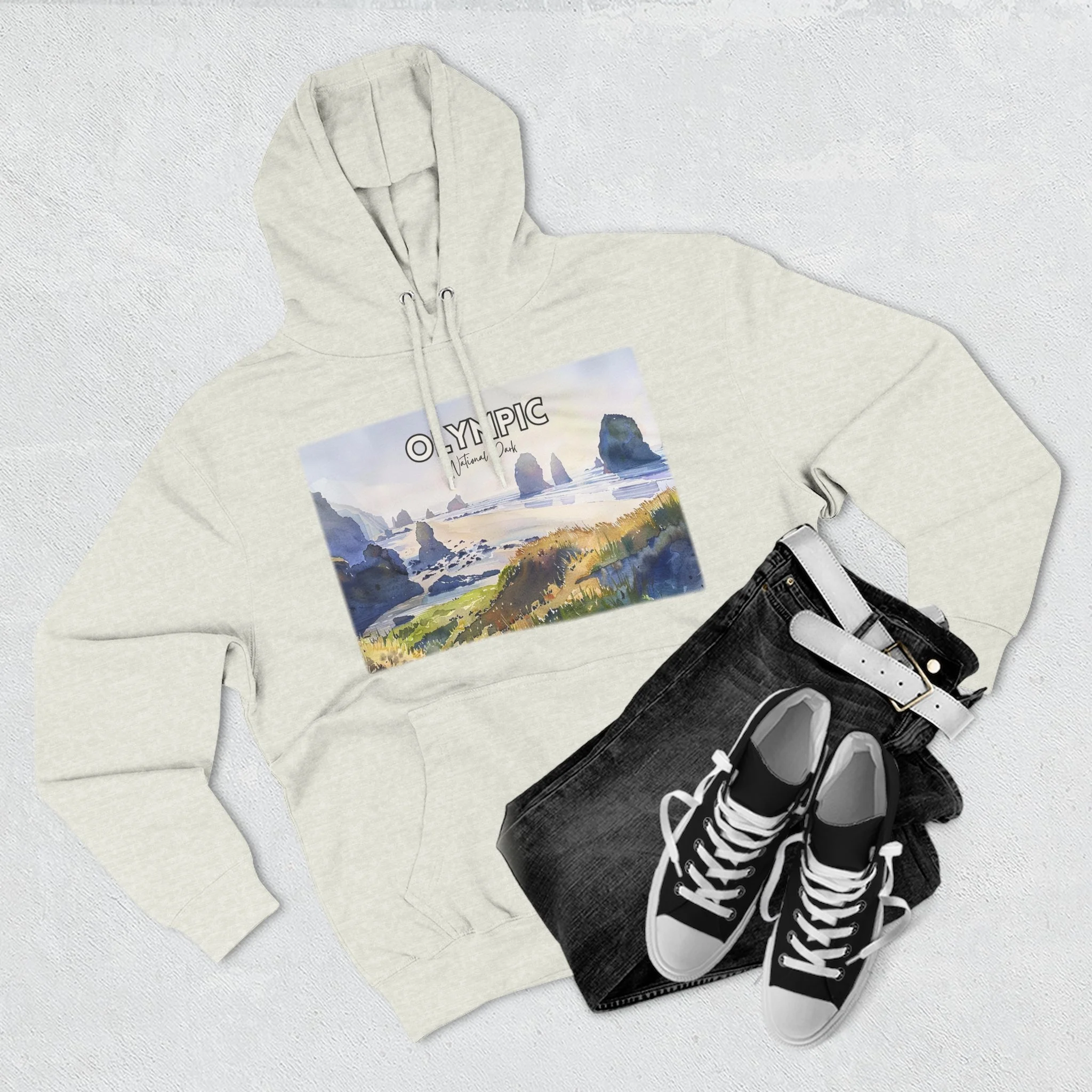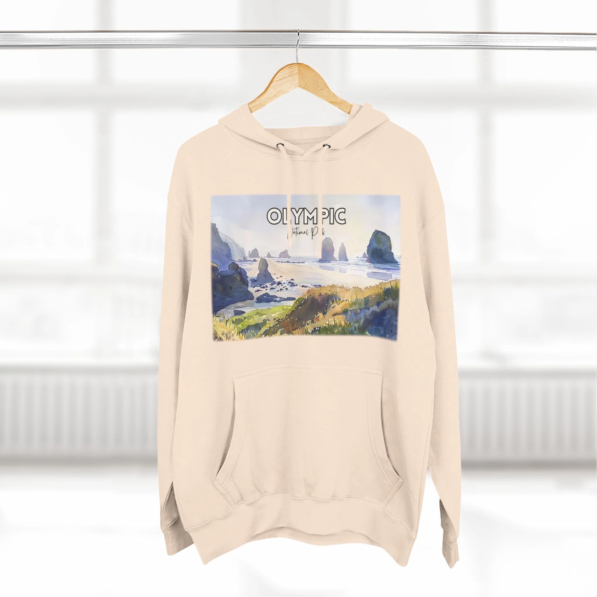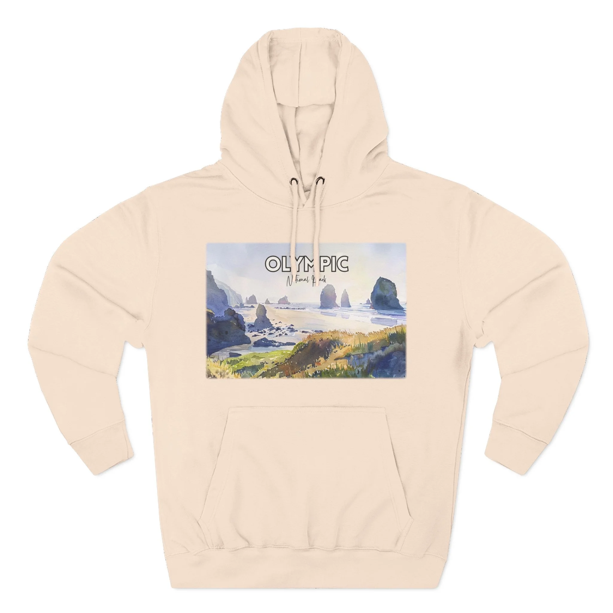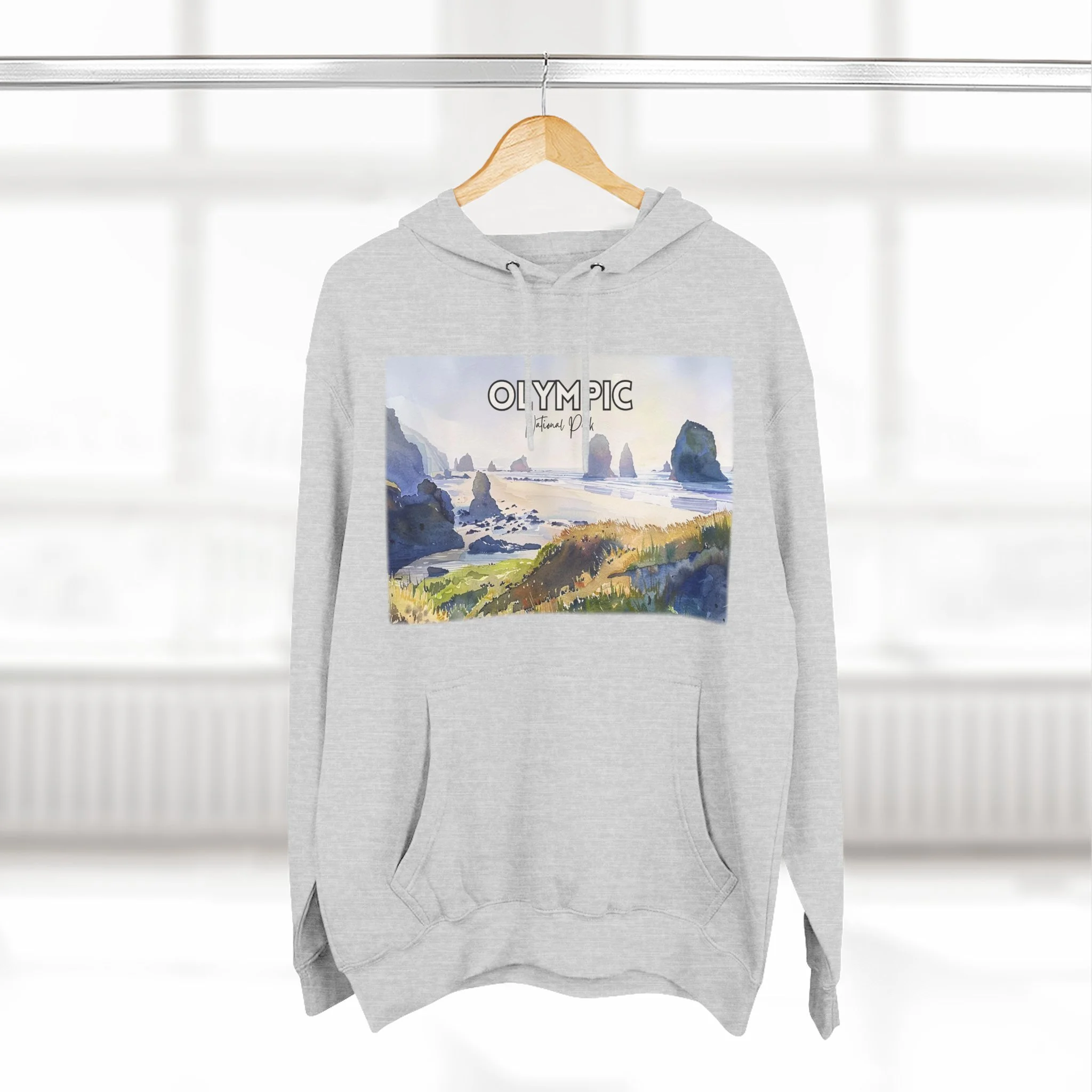 Shi Shi Beach Hoodie – Olympic National Park Watercolor Pullover with Coastal Cliff and Ocean Artwork