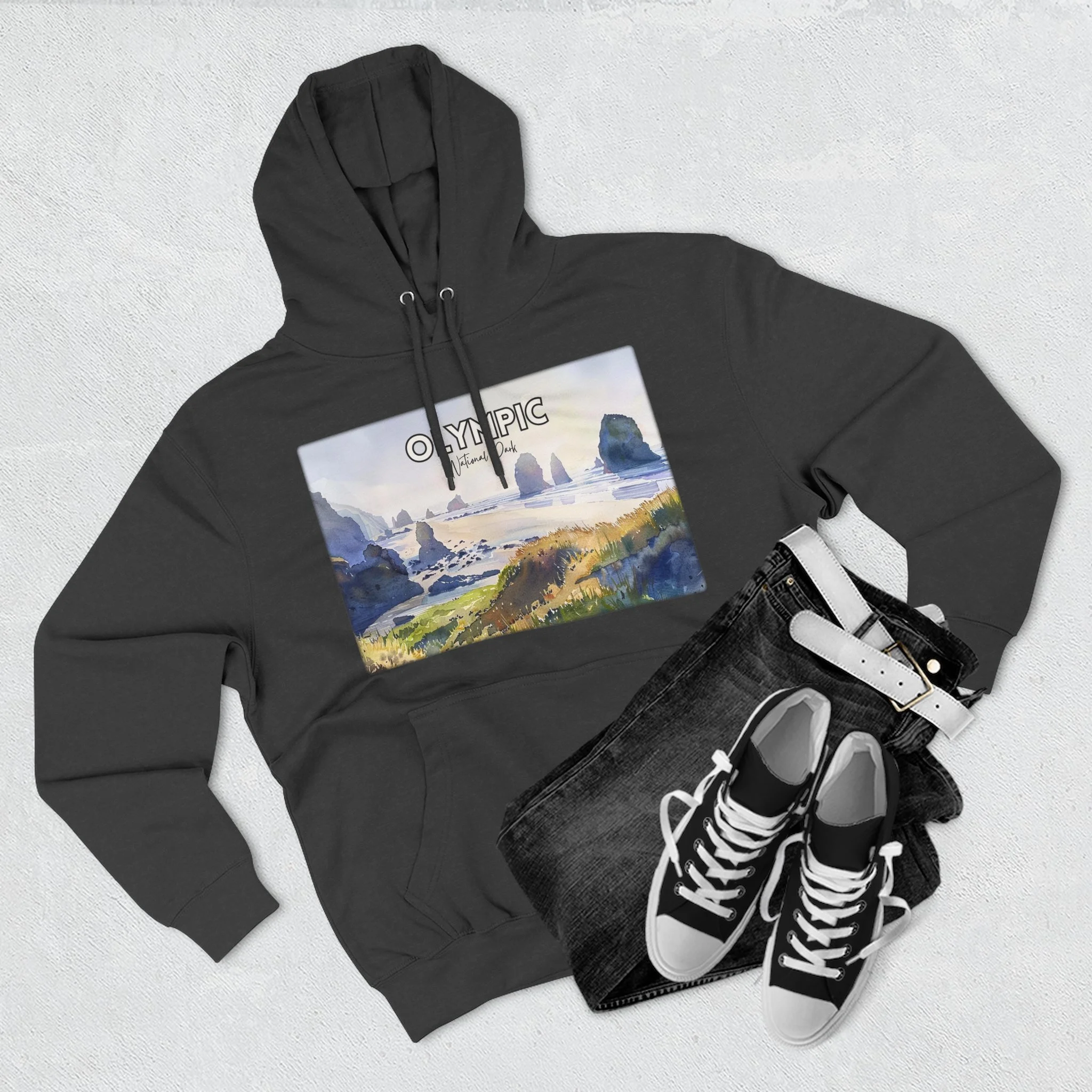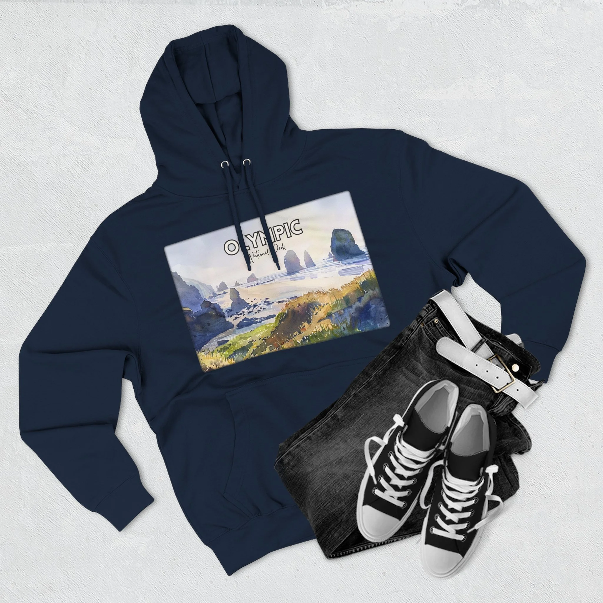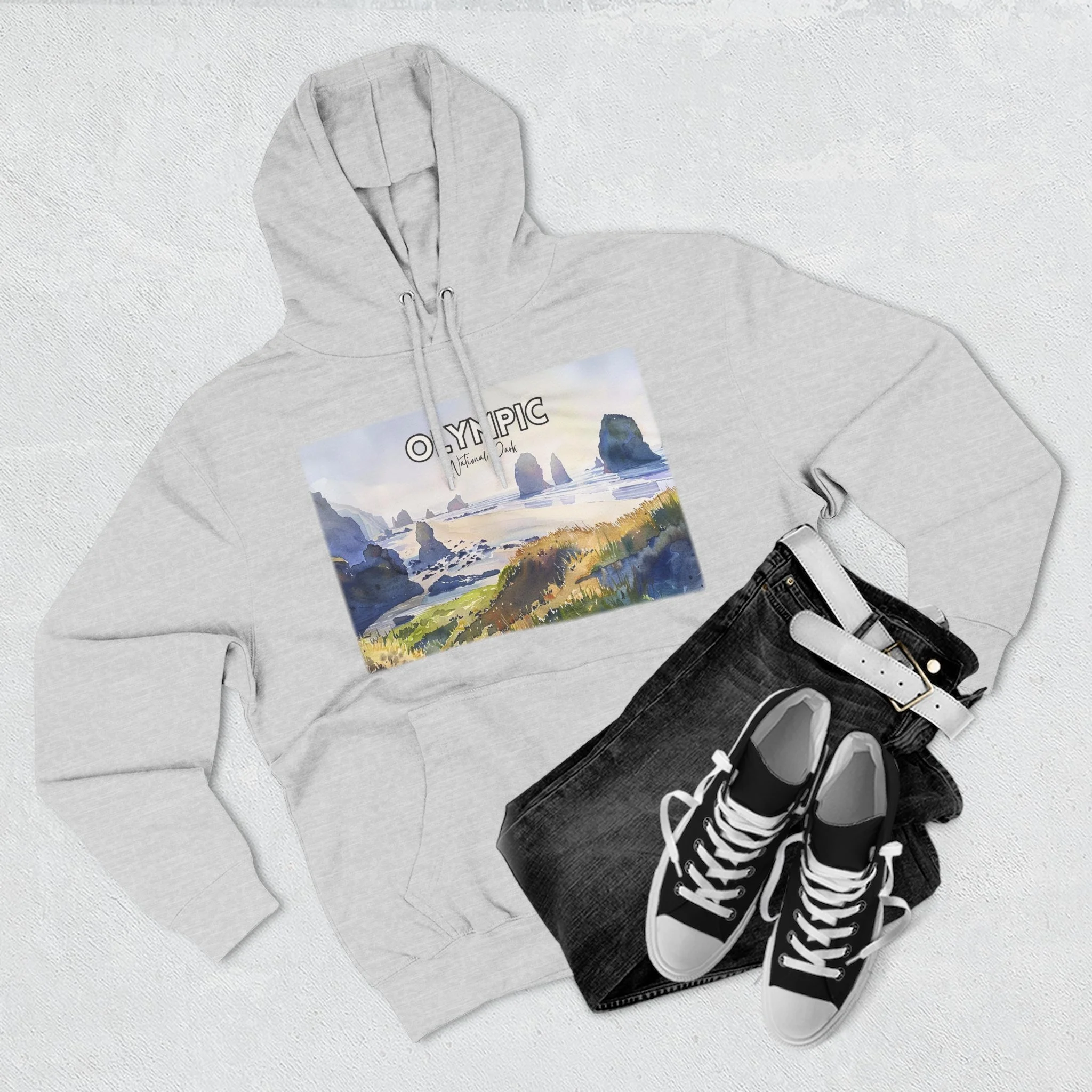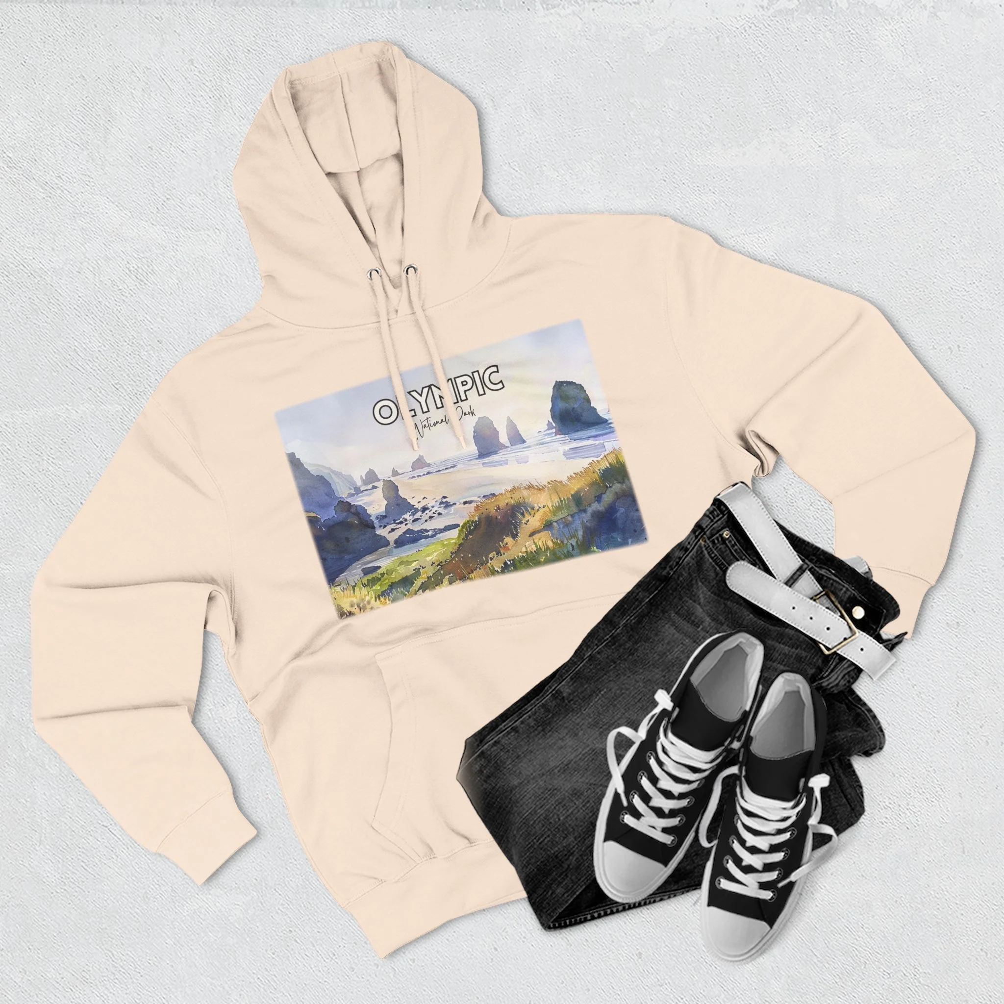 Shi Shi Beach Hoodie – Olympic National Park Watercolor Pullover with Coastal Cliff and Ocean Artwork