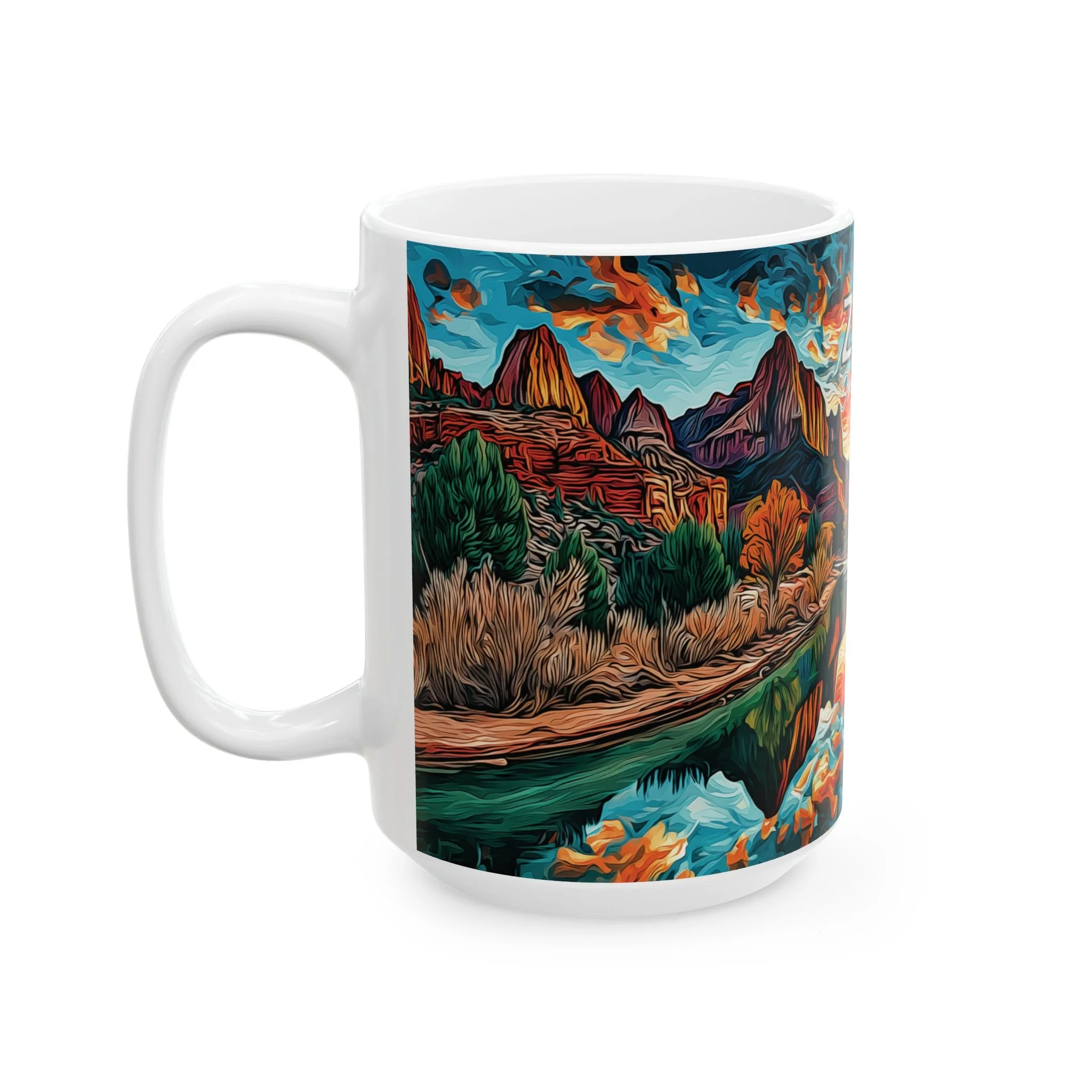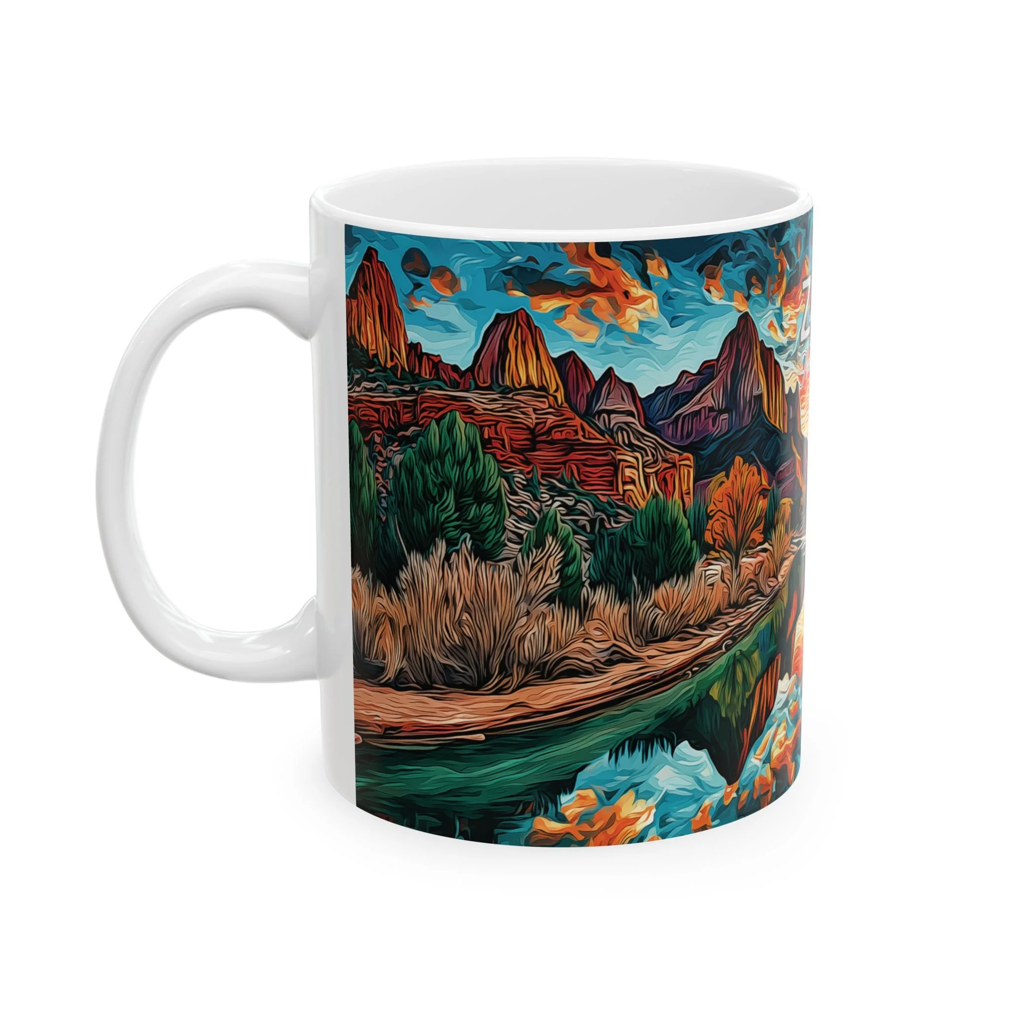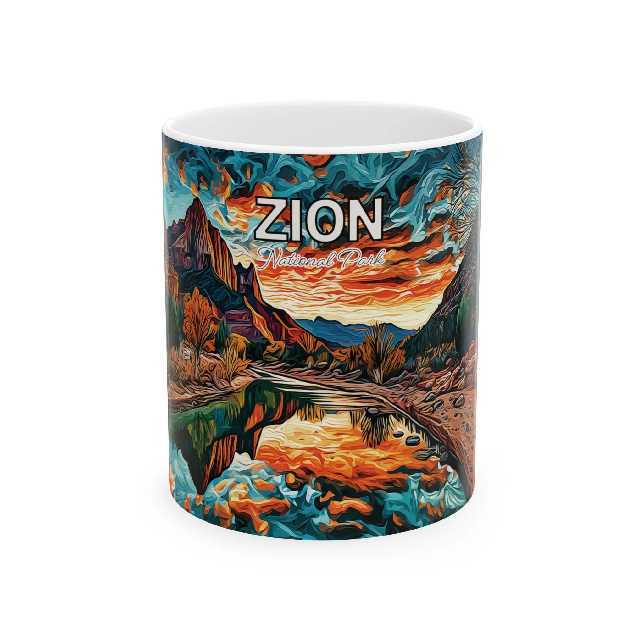 This mug offers a different take on Zion-inspired drinkware by focusing on the close-up textures and organic forms that give the Narrows its distinct character. Rather than centering on a broad overlook, the design reflects the tactile beauty of river stones, flowing water, and softened natural shapes. The abstract acrylic style gives it a more elevated, artful presence while keeping it clear and product-focused for everyday use.
