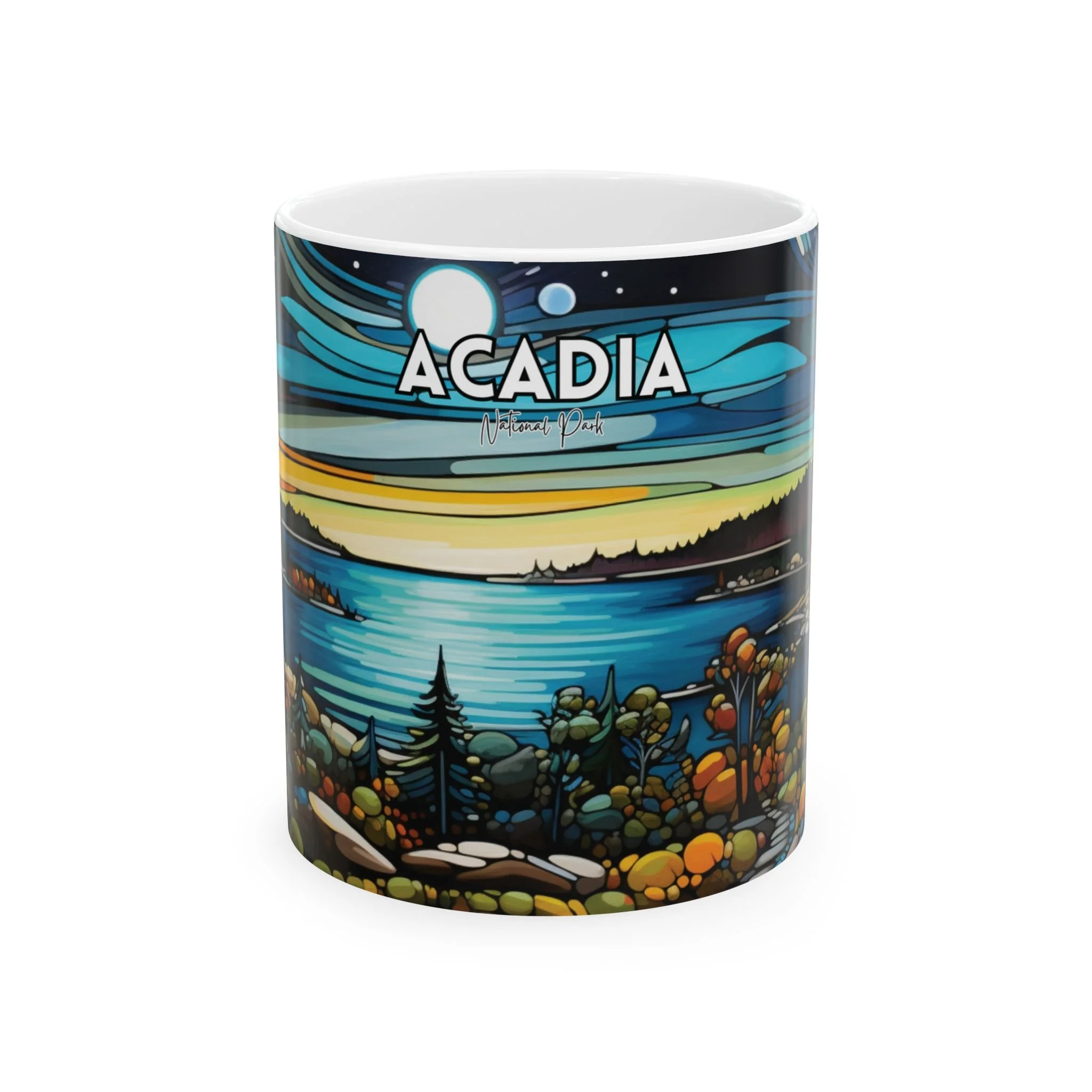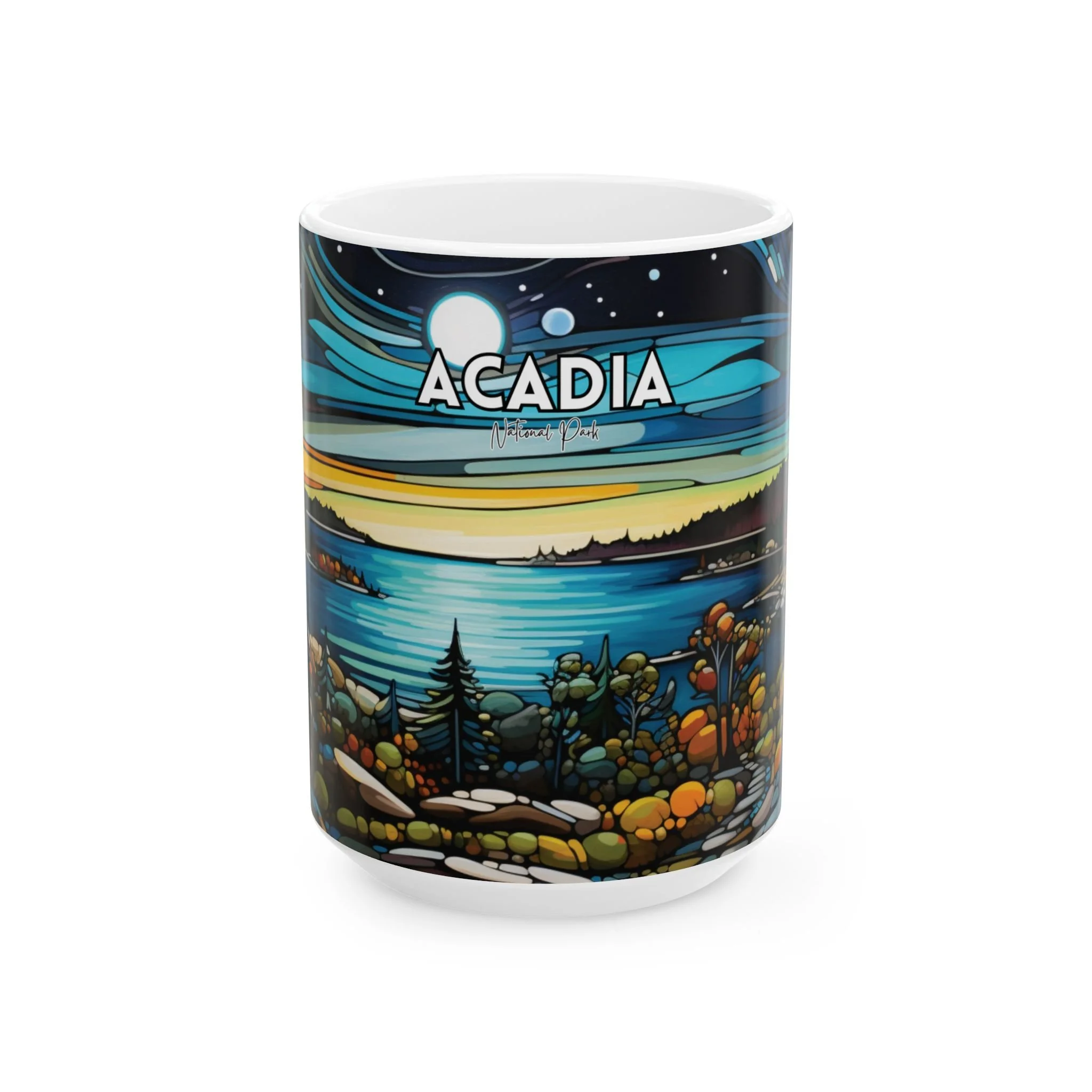 Experience the wonder of Acadia at night with this abstract acrylic art mug. The dynamic design captures a starlit sky over the iconic park landscape in rich, expressive brushstrokes—bringing the beauty of nightfall into your everyday coffee ritual. Crafted from durable ceramic and available in two sizes (11oz and 15oz), this mug is both microwave and dishwasher safe. It’s a striking gift for lovers of modern art, the cosmos, or the quiet power of national parks after dark.